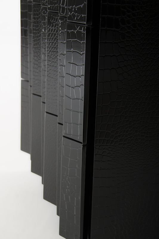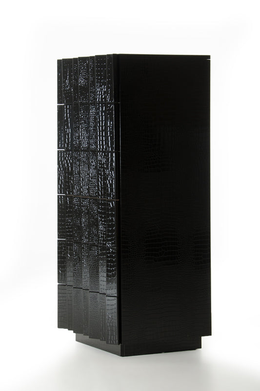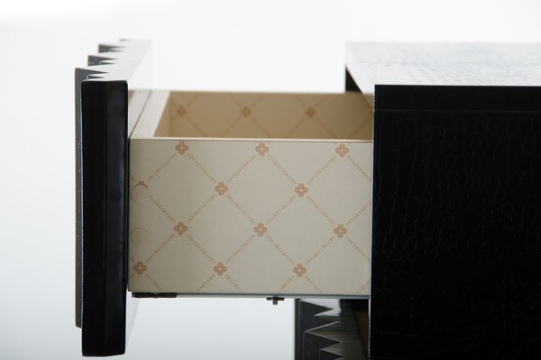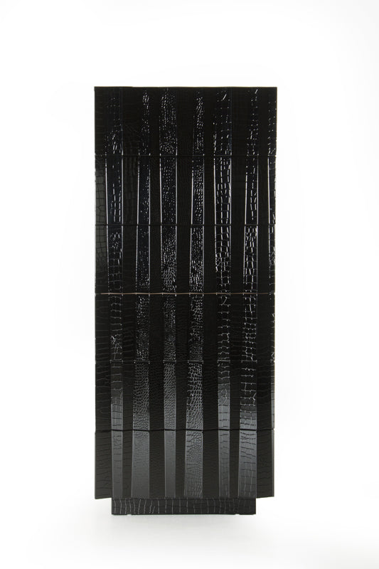 The A&X Emphasis Black Crocodile Chest features a sleek black lacquered crocodile textured finish fitted with 6 spacious soft-closing drawers with a patterned lining. With a dimension of W21" x D19" x H49, this modern chest does not require any assembly.