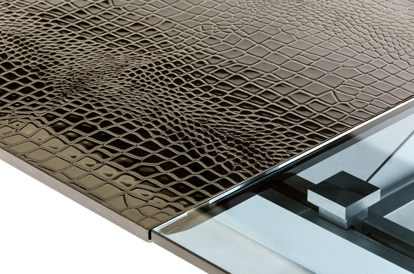 The A&X Stratton Modern Black Extendable Dining Table presents an ingenious modern design featuring a tinted glass top, revealing a black high gloss lacquered middle board when extended, from 63" to 95". The extendable table sits on a white slab attached to the black high gloss lacquer finish legs. Measuring W63"/95" x D39" x H30", this modern dining table provides more value to any dining room.
