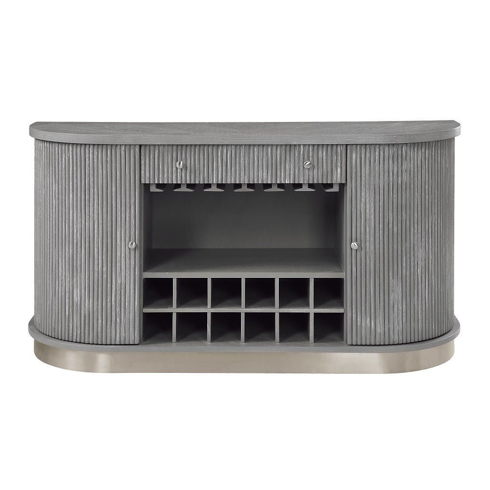 This Adalynn server brings a sleek space for you to store and display your wine bottles and stemware in your dining room or eatin kitchen. This piece stands on a sturdy wooden frame with a sleek silver metal base and is finished in a weathered gray oak finish that showcases white wooden grains. Features a slatted textured frame with rounded corners for a sculptural silhouette. It has a drawer and two cabinet spaces; plus stemware racks and wine bottle storage. Streamlined with luxe details, it complements glam and contemporary decor styles.