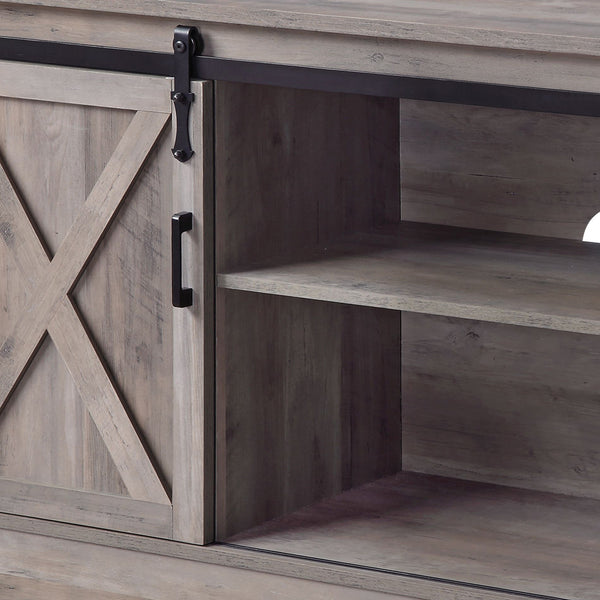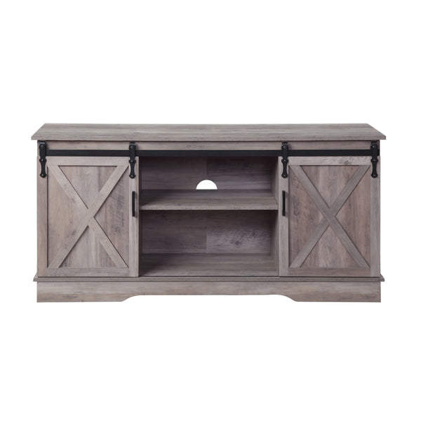 Enjoy a warm and cozy family TV time with this cottagestyle TV stand. The rustic casegood has two sliding barn doors with classic Z overlay and pull handles. Metal sliding hardware is coated with black finish, providing smooth operating and chic look. Two media compartments with back holes for cable management help you organize all your television equipment, while four covered storage spaces behind doors preserve your CD collection or personal items.