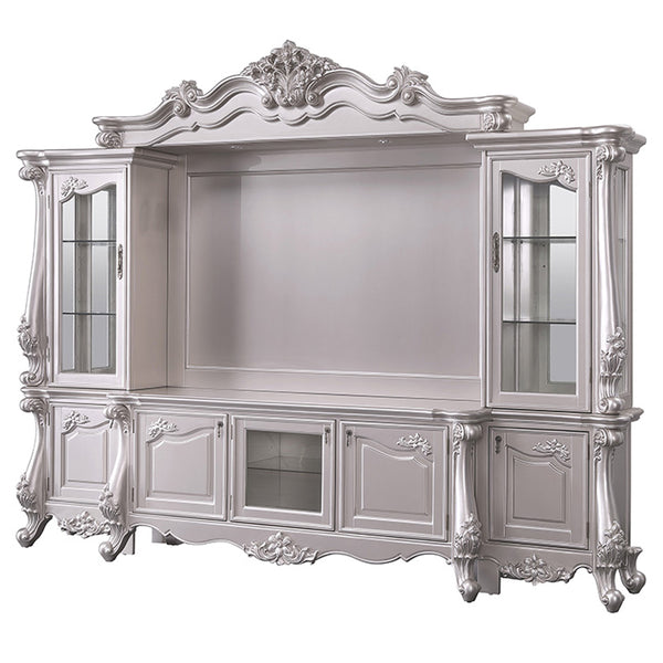 The Bently entertainment center is the perfect centerpiece for your media room. Gorgeous carved floral motifs and oversized Queen Anne legs grace each part of this set. The TV stand easily accommodates a 70inch panel TV. Coupled with the side piers, you'll have provide plenty of storage space for organization or display. A lavish carving crowns the lighted center bridge to emphasize the glory of this elegant, champagnecolored entertainment set.
