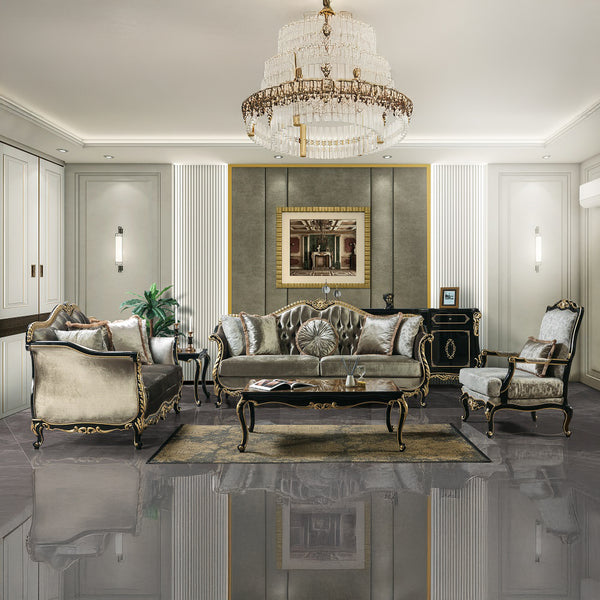 In a modern black, gold, and light green colorway, the Betria loveseat is both contemporary and timeless. Gold paint accentuates the carved details against the shiny piano black foundation. Silky smooth light green velvet upholsters this loveseat. Perfect in a formal living room setting to impress your guests. It includes throw pillows in contrasting fabrics.