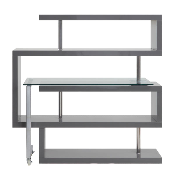 Designed for spaceconscious, the Raceloma writing desk with shelves is excellent for those with smaller spaces. The winding Sshaped shelf bookcase instantly transforms any room giving your books and decor a vibrant stage for display. Adding function to the design with a convenient rollout desk with a sleek glass top, use it as an extra shelf on the bookcase when not in use. This desk makes for a contemporary multipurpose piece in smaller spaces.