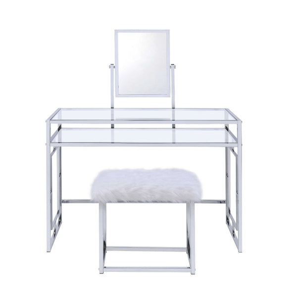 ACME Carenze II White Faux Fur & Chrome Vanity Set Model 90314
