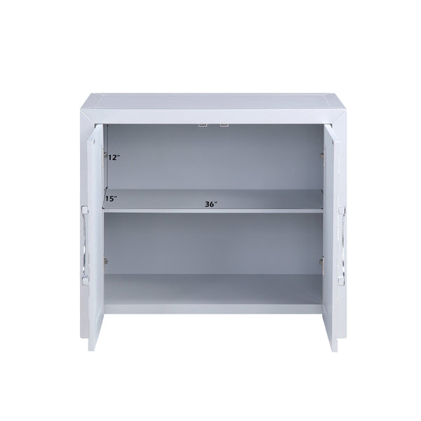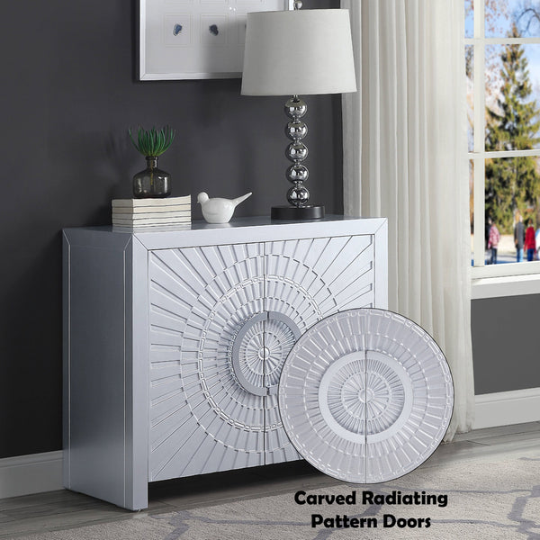 Abstract motif pattern design exudes modern charm and grace through minimalism, simplicity, and purity of lines. A dazzling sunburst pattern radiates from the center of this piece, creating an attentiongrabbing look that pops. The crisp white finish is focused on bringing out the color and timeless beauty. This stylish cabinet features two doors that open to reveal spacious storage space for hiding odds and ends.