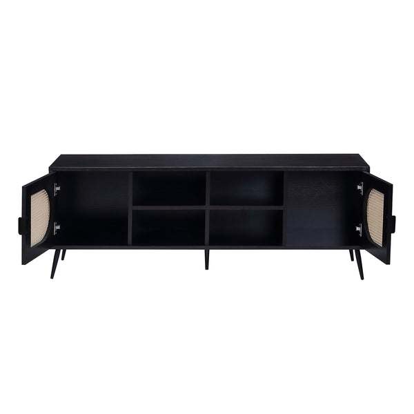 This Colson TV stand is the perfect addition to your home. The black finish matches any decor and gives your space a modern feel. It has rattan door front inserts, giving it a light and airy feeling. The legs are tapered, for a modern flare. Featuring four open compartments that provide easy access to all of your media devices at once so you can easily change batteries or other components without having to move anything out of place.