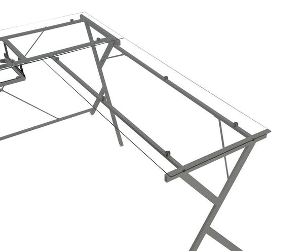 Characterized by modern simplicity of form and function, the Demas Desk creates a clean, open, lightfilled space that refreshes your mind while improving your productivity. Minimalist metal frame works perfectly with the tempered glass top in "L" shape design, making your workspace feel more spacious and breezy. Under the desk top is keyboard tray that frees up valuable desk space and attached computer holder is outfitted with wheels for easy movement and cleaning.