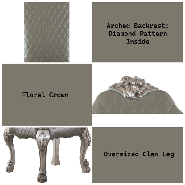 A modern upgrade to a traditional French design complete the look of any room with the Dresden Side Chair. Impart an air of elegance, sophistication, style and poise as you confidently sashay your way to your seat. As the chair slides back, the light shines on the sshaped legs of the bone white oversized claws. You situate yourself on the soft warm Gray quilted leather as your eyes meet a room filled with envious eyes.