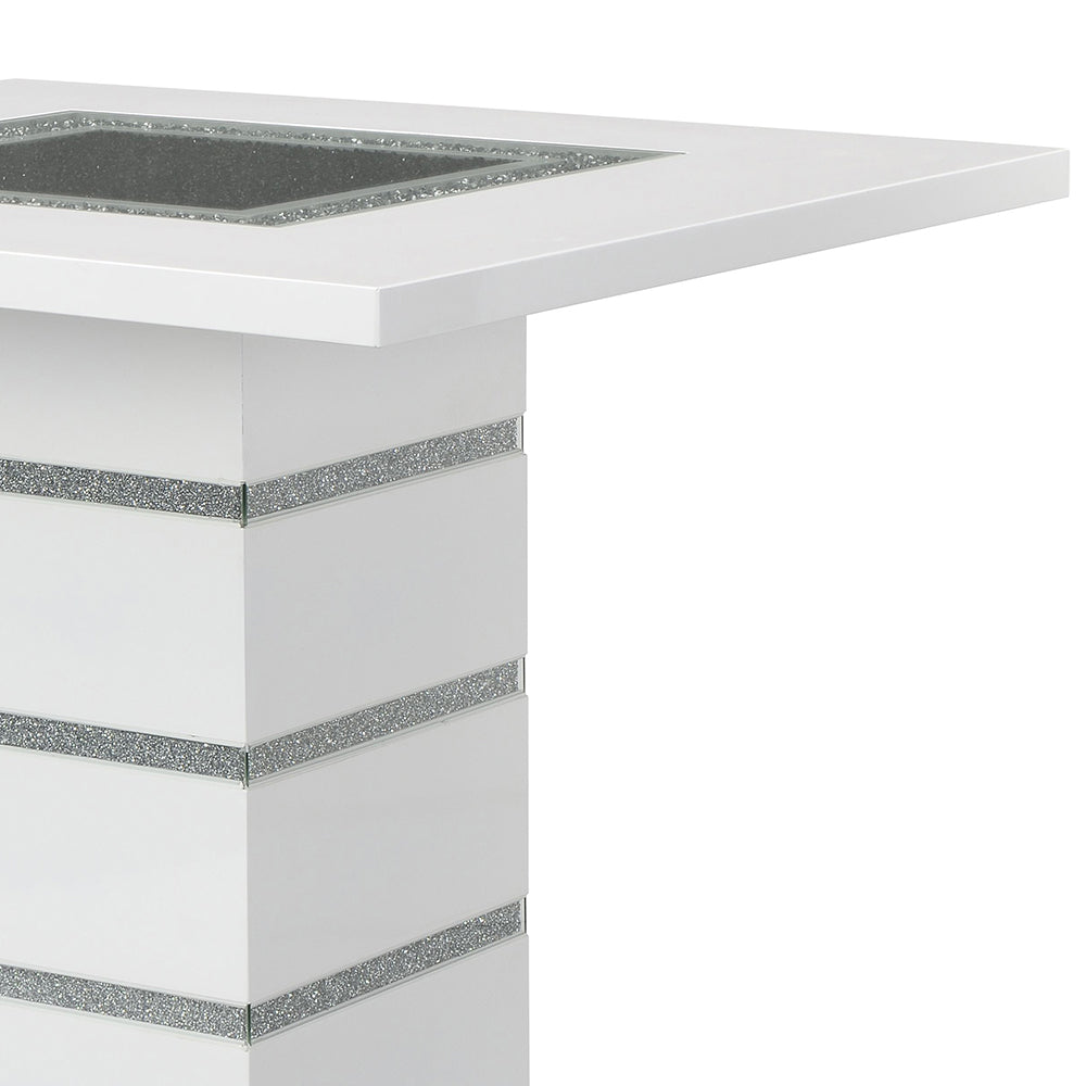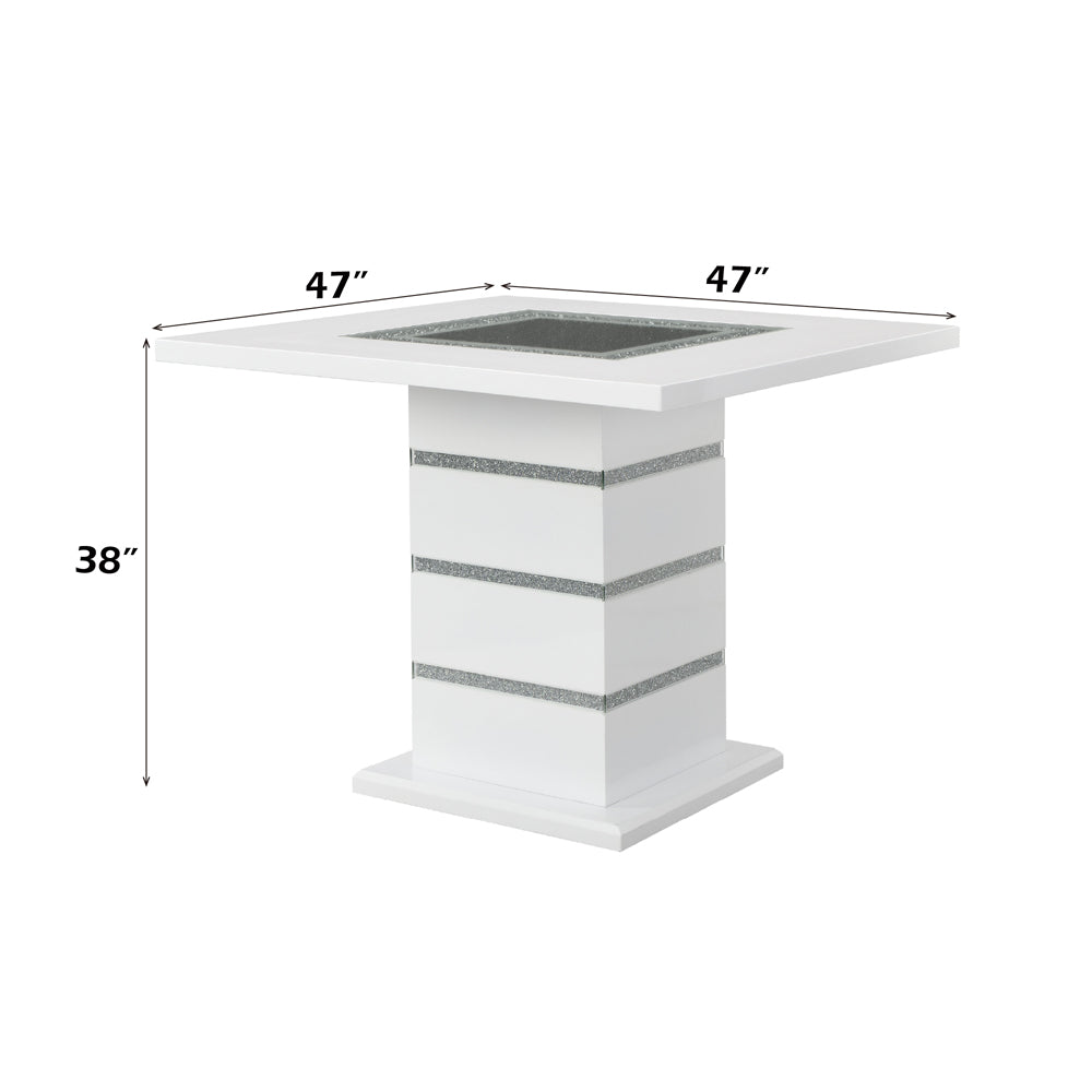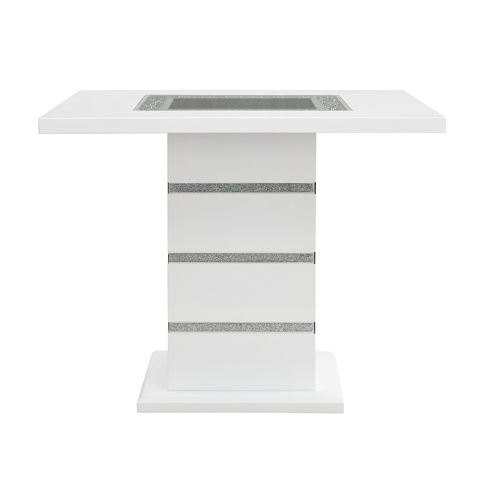 Perfect for a kitchen nook or a smaller dining space, the Elizaveta counter height dining table will fulfill all your dining needs. The white high gloss finish blends in perfectly with the glimmering faux diamond inlay base. The tabletop features silver and black faux diamonds for an added wow factor.