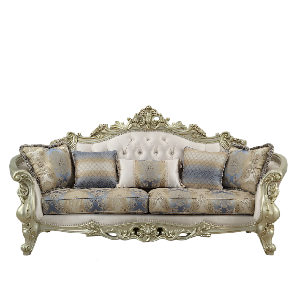 Exclusively designed and filled with romantic spirit, this beautiful sofa features Queen Anne legs and carved aprons and trims, decorated with raised and scrolled floral motifs in a golden ivory finish. Each piece of this sophisticated living room set boasts of curved and rolled arms, oversized molding and crystallike button tufted backrests with nailhead trim. This three piece collection with contrasting accent pillows will bring sophistication to your living room and will add elegance to any room Decor.