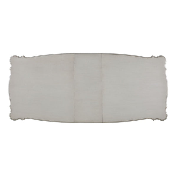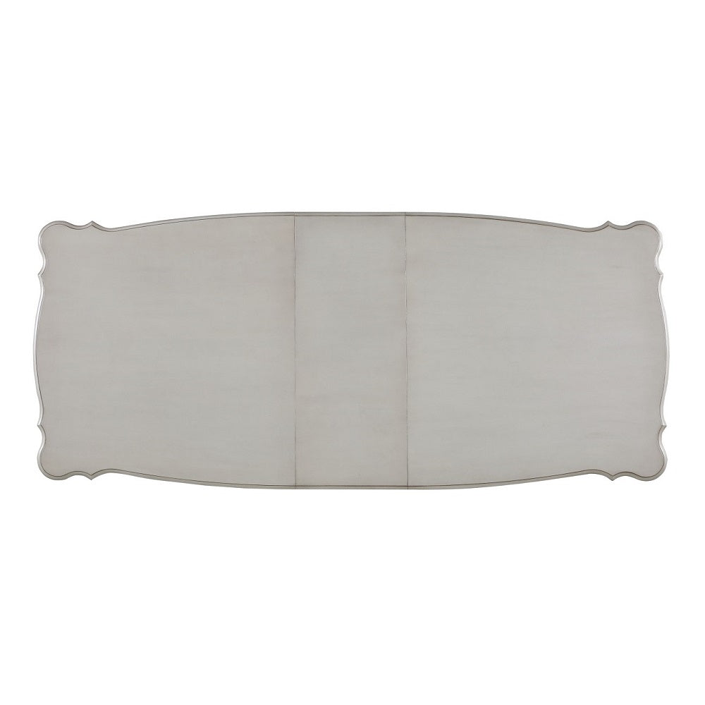 Exclusively designed and filled with romantic spirit, this beautiful rectangular table features a pedestal base with Queen Anne legs and carved apron and trim, decorated with raised and scrolled floral motifs in a golden ivory finish. This stylish and detailed collection is ideal for a large gathering and will add elegance to any dining room Decor.