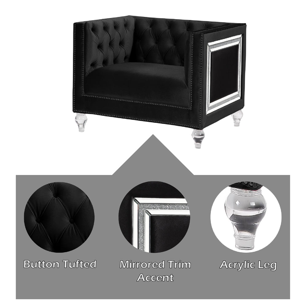 Looking to create a glamorous living room, look no further. The Heibero collection is ideal for that. Featuring timeless button tufting and the more modernized fine details such as the mirrored trim accents. The burgundy velvet upholstery is an eyecatcher. Have the best of both worlds contemporary and classic all in one with this collection. Solidly constructed, this sofa rests securely on four acrylic legs. This collection is a perfect solution for providing seating for you and all your guests.