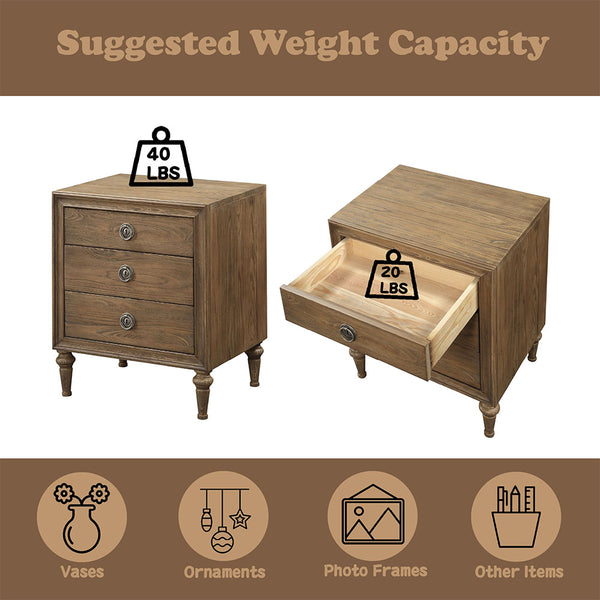 Natural ambiance follows a versatile finish and woodgrain effects of this quaint threedrawer nightstand, an optimal selection for an antiqueinspired bedroom setting. Reclaimed oak finish wood adds distinction to this nightstand with three drawers, including a feltlined top drawer. Drawer operation is smooth and easy with metal side glides and full extension ball bearings. English dovetail front and back construction joins wooden turned tapered legs, embellished with classic metal hardware.