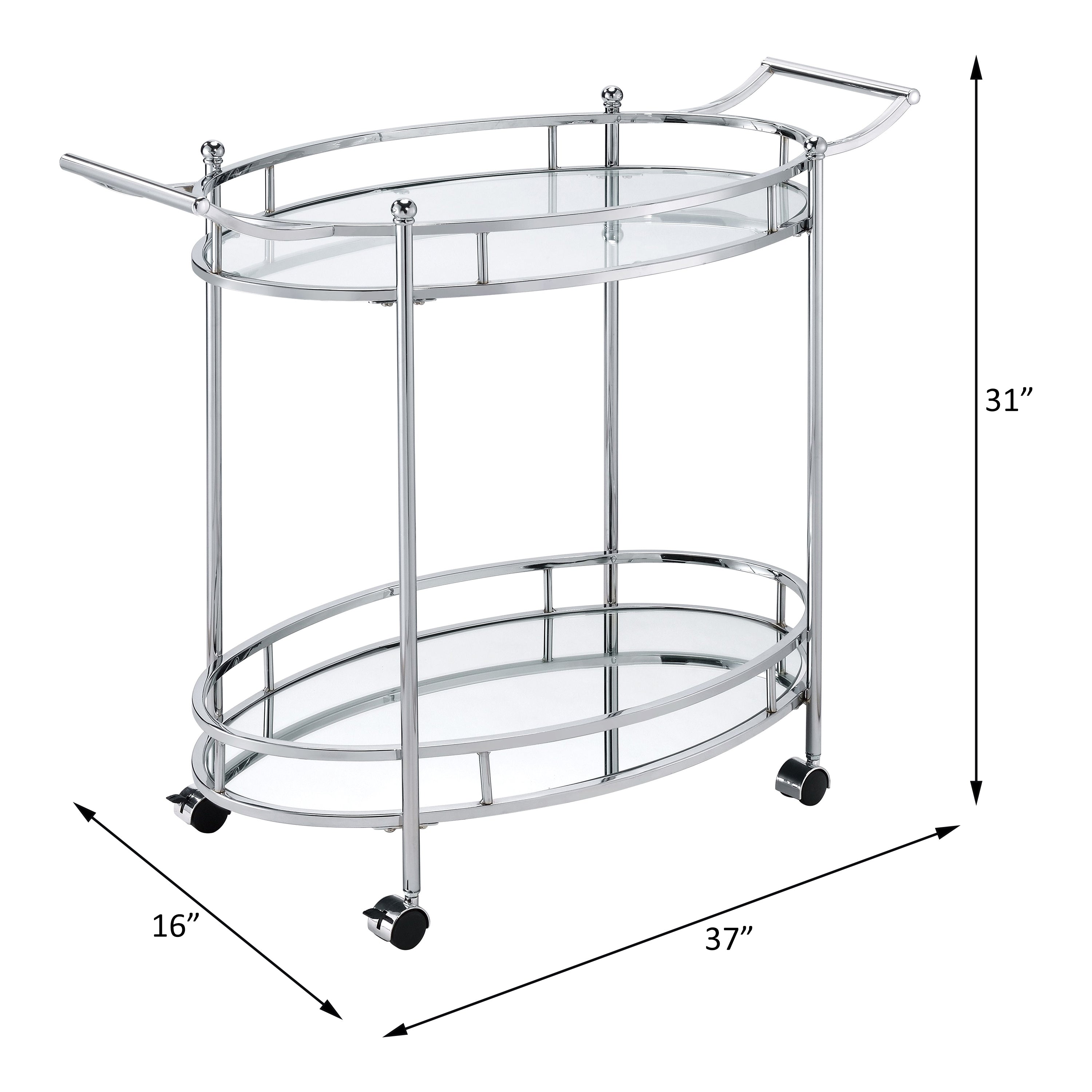 Instantly transform an ordinary room in to a minibar with this brilliant accessory. Two clear glass shelf allow you to display delicious drinks and delicate glassware. Supporting metal frame features a simplistic silhouette with chrome finish giving a modern touch. Two handle design and wheel stop make it easy to move around and place it where needed.