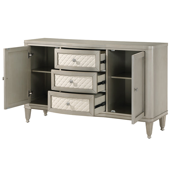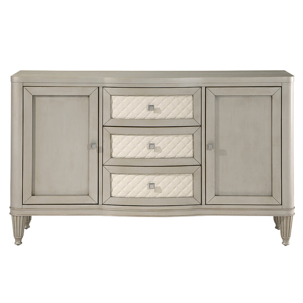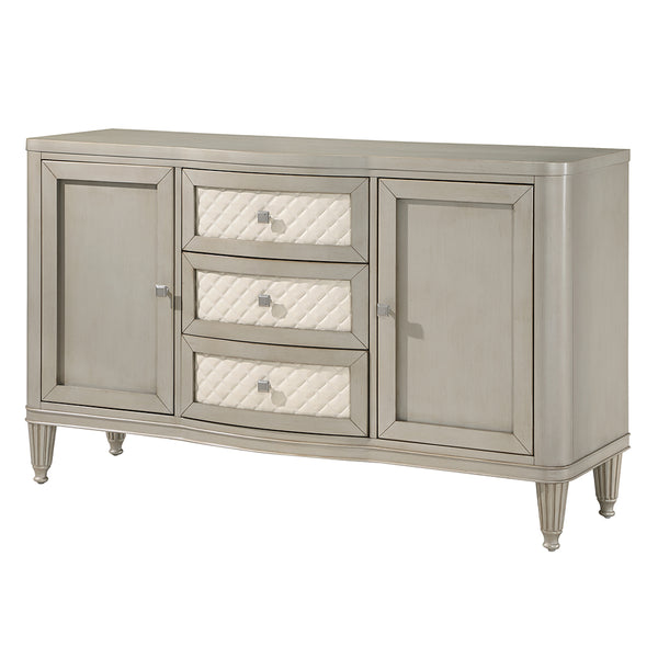 Give your dining space a muchneeded storage solution with the Elyssa server. This server features three ample drawers and two side cabinets for all your extra dishware, glassware, and linens. The drawers showcase synthetic leather quilted drawer fronts. The piece sits on eight beautifully crafted fluted wooden legs. It is finished in a champagne color that adds a stylish touch.