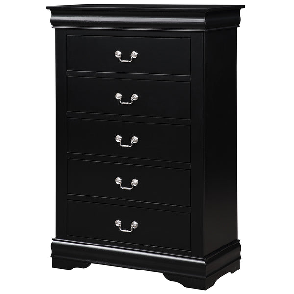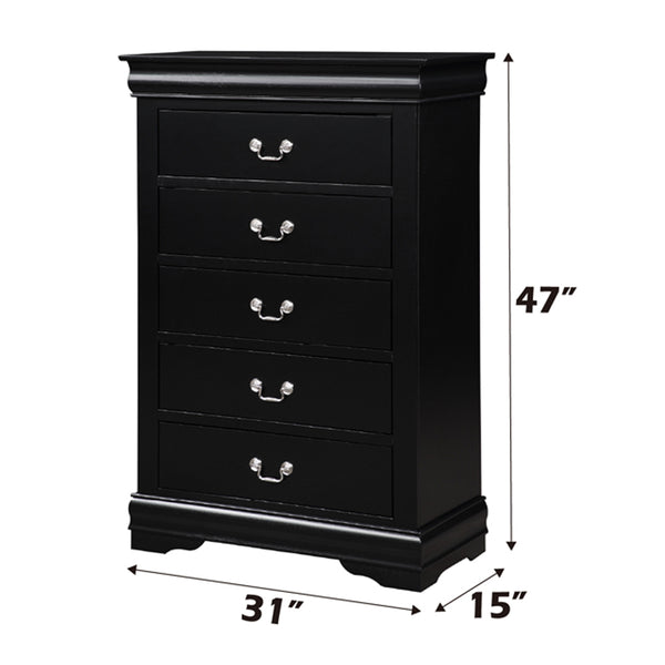 The Louis Philippe Chest in black finish is equipped with brushed nickel metal hardware that lends antique elegance. Store bedding, clothing, and more in the five roomy drawers. Choose from available finish options to best coordinate with existing bedroom furniture.