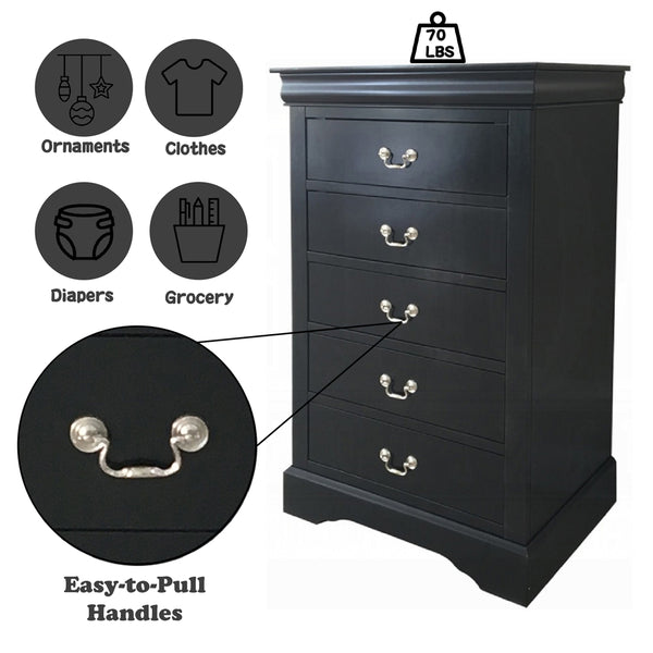 This Louis Philippe III chest comes in black, cherry, white, and antique gray finish. 5 Drawers with brushed nickel metal hardware and center metal Glides offer ample space for your clothes, bedding and linens. This beautiful chest will be the perfect complement from the most sophisticated to decor casual settings.