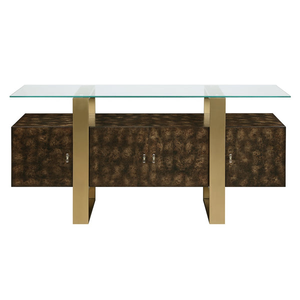 Elevate your home with this Collection console table. The brass and the antique finish give this piece a contemporary worldly appeal. Providing plenty of display space and storage. The sleek tempered glass tabletop will give your decor the illusion of floating. The metal brass base is elegant and provides the right amount of visual interest to the piece.