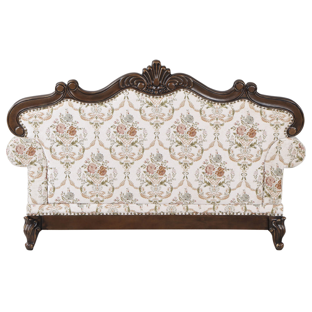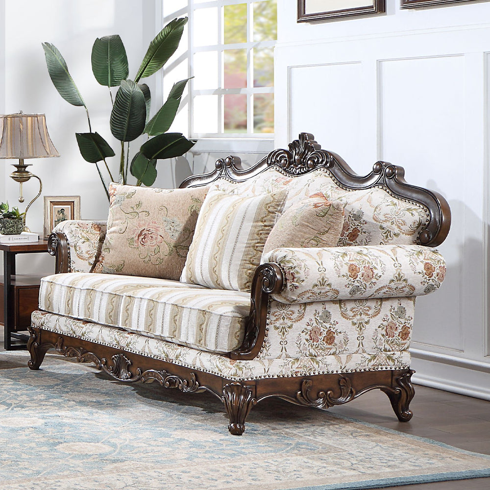 Victorian antique design without the musty moth odor, this design offers unparalleled evocative refinement. The beautiful Nyla sofa is great for creating an inviting classic home. wooden carvings decorate the crown and apron. The rolled arms add more of that vintage charm and provide plush comfort. The floral fabric upholstery and striped seats further enhance the appeal. The assorted patterned throw pillows are included.