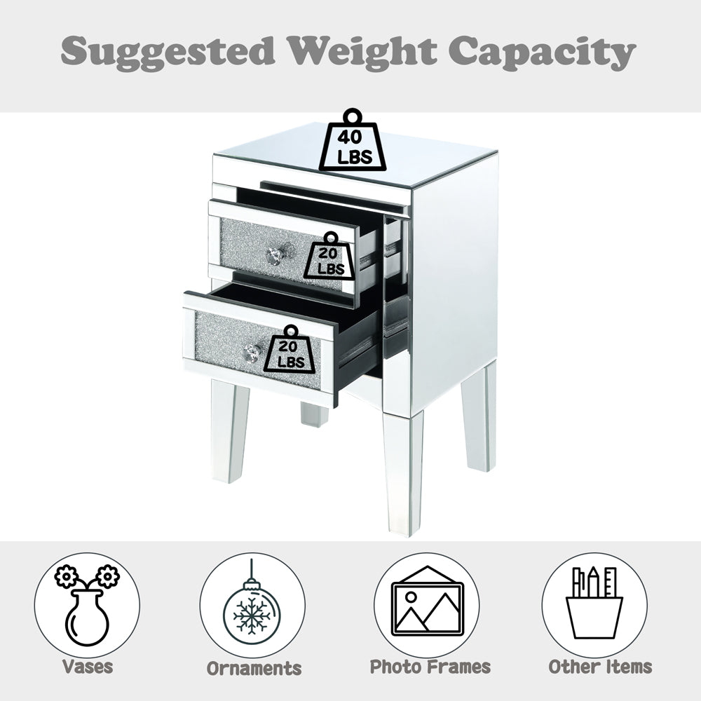 A crisp linear silhouette speaks to the modern aspect of glam design as this mirrored twodrawer accent table plays a part in an ultracontemporary space. Radiance and gleam capture attention in a piece covered with sleek mirrored glass panels and set atop tall, tapered mirrored glass covered legs. Easyglide drawers with decadent faux diamond and clear glass inlays infuse convenient storage capabilities. This chic table is ideal for living spaces and bedrooms.