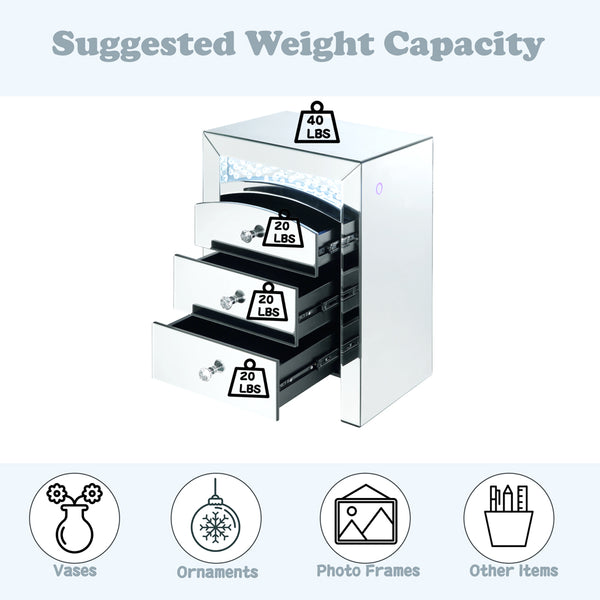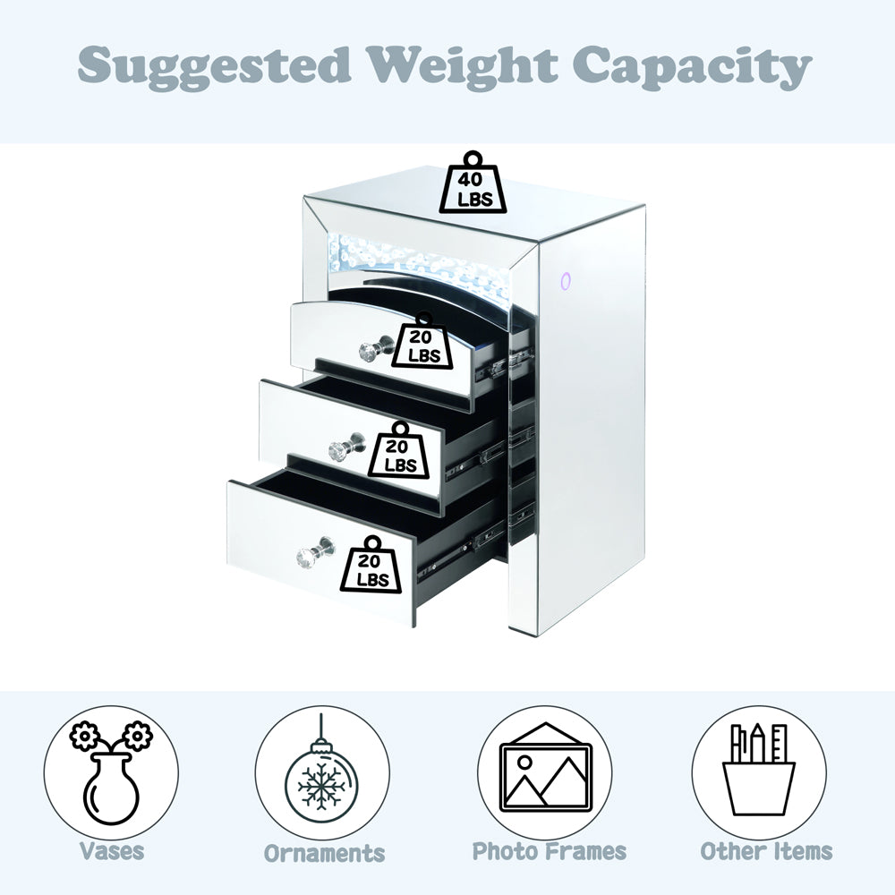 Glam up your bedside with the Nysa mirrored night table with faux crystal Inlay, and ultracool LED lighting. All visible sides of this chic nightstand lined in polished glass mirrors. Three drawers with side metal glide offer easy bedside storage access.