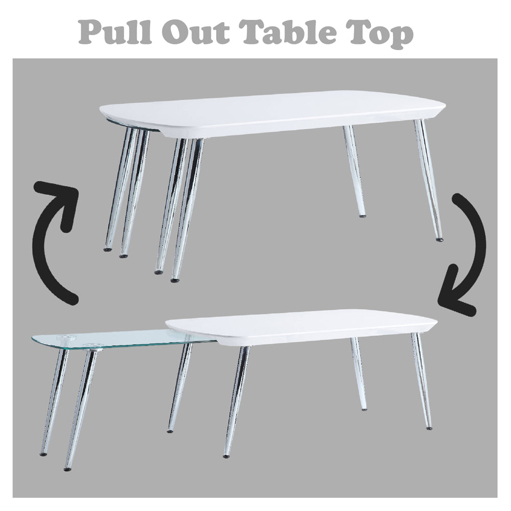 The coffee table features a smooth surface and round edges, making your living room familyfriendly. Rounded and softened lines mixed with sleek metallic touch give you a distinct look with contemporary style. Shiny chrome metal legs paired with highgloss finished tabletop keep the table looking clean and fresh. A hidden glass tabletop easily pulls out to create much more space whenever you need it.