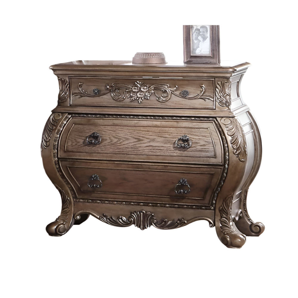 The Ragenardus nightstand is an impeccable example of truly memorable luxurious traditional design. This threedrawer vintage oak nightstand features a detailed French style front and English back in a stunning Bombay shape case, FeltLined top drawer, side metal Glides, scrolled legs and antique pullring handles. This beautiful nightstand will bring the perfect traditional style to any bedroom.