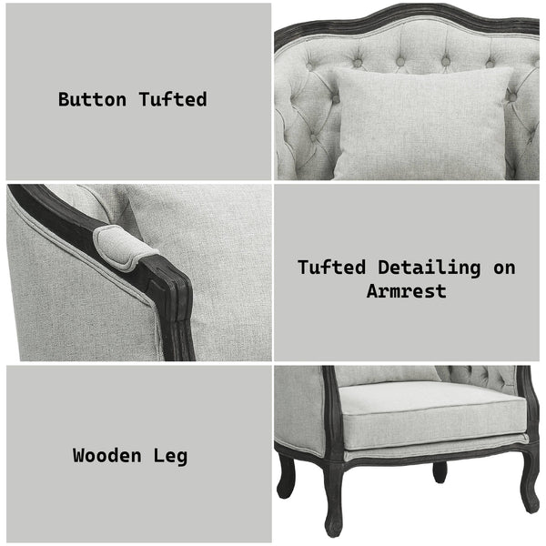 With a nod to vintage French design, the Samael is a modern interpretation of a camelback sofa is distinguished by its exposed, and beautifully carved, wooden frame that wraps you in comfort. Its curved frame with a winding front rail sits off the floor on carved cabriole legs. Enveloped in graycolored linen, the piece features a deep bench seat cushion