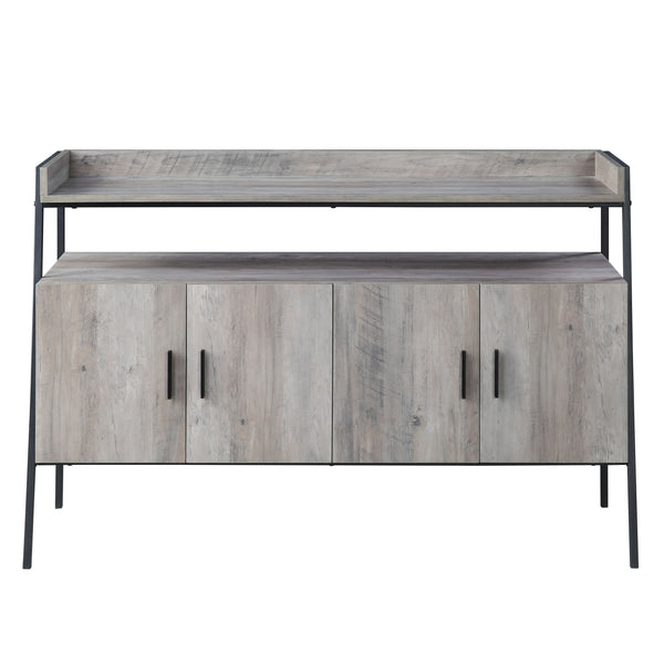 Black metal constructed durable structure features a minimalistic, clutter free aesthetic with a trapezoidal silhouette. The Gray oak finish on the wooden storage section creates warmth and provides a neutral base to pair with your living room decor. The Samiya TV Stand has two wooden cabinets for your personal items while rectangular table top with a open bottom shelf is large enough to hold your TV, Bluray player, and any other media accessories.