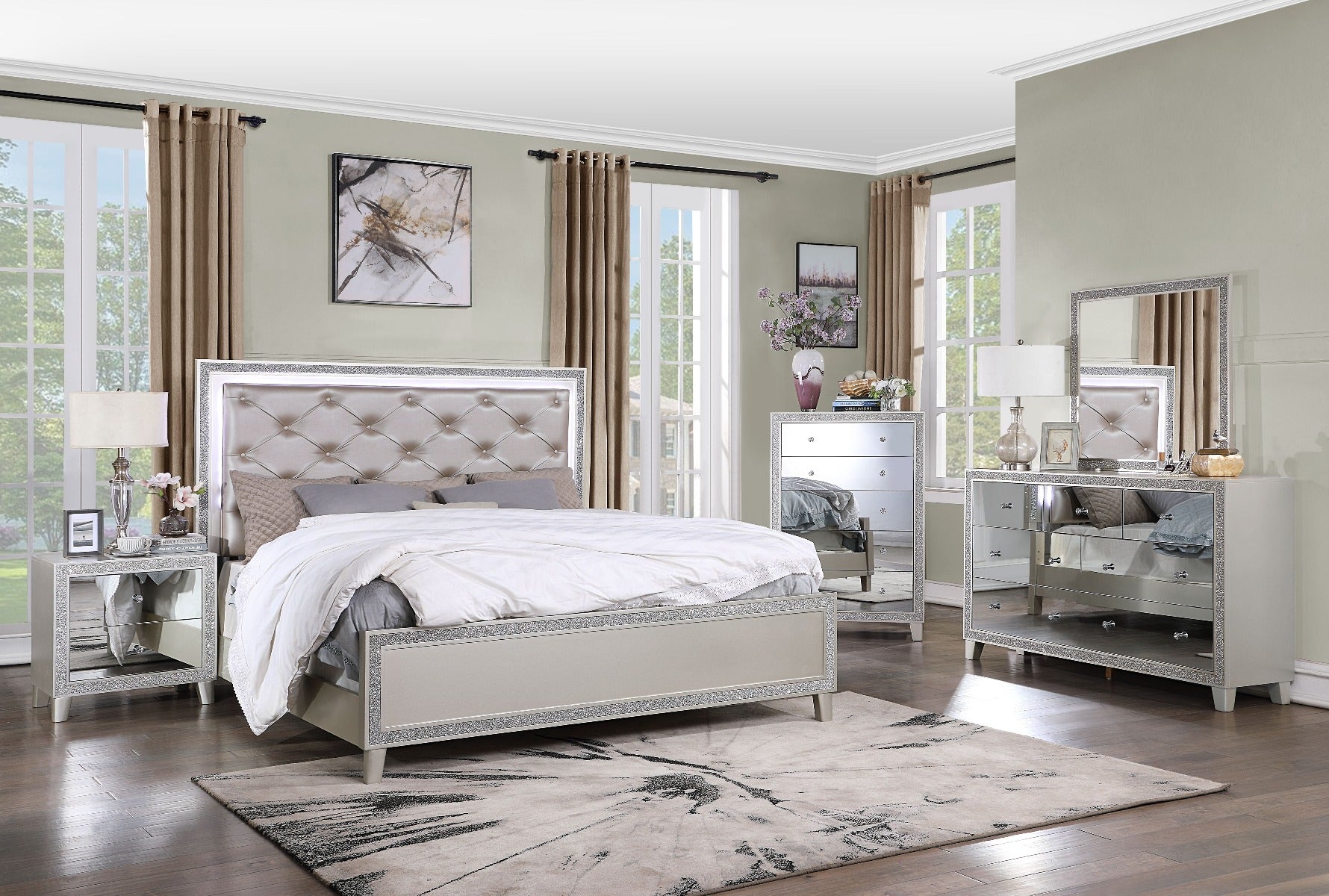 This modern glam bedroom collection uses mirrored furniture, metallics, and muted color tones to brighten up your place. The collection is adorned with eyecatching decorative accents like buttontufted headboard, raised molding trim, and LED lighting. Matching casegoods feature selfclose drawer glide and feltlined top drawer for safety and function. The mirrored finish applied on each piece creates a shiny and lustrous surface, gently reflecting light that passes through the room. The Sliverfluff Bedroom Collection will bathe your room decor in glamorous luster and elegant glow.