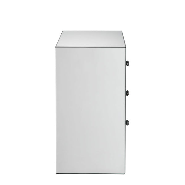 The contemporary Sonia nightstand is a dazzling statement piece for you to display anywhere in your home. The modern nightstand is fully mirrored and features a mirrored drawer front and sled base with crystal and quartz like inserts. With three storage drawers and beveled trim finish, this unique piece is a welcome addition to any foyer, bedroom or sitting area.