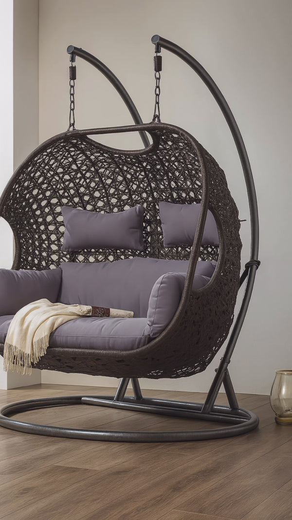 Take advantage of summer weather and soak up the sun with the Vasant patio swing chair and stand. The removable foamfilled cushion and egg shape make relaxing enjoyable for hours with its bodyhugging shape. The allweather wicker will stay pristine for years to come. Spacious enough to comfortably seat two or for one person to lie down.