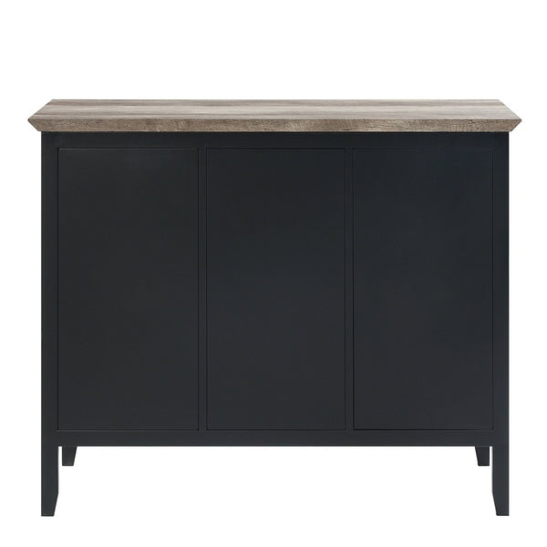 There are endless possibilities with this Zudora server cabinet to maximize your space. It gives ample storage space while keeping everything contained and out of sight. Two black slatted doors open to reveal a stemware holder, bottle storage, and an ample storage space, while the other side can be used to display your favorite vintage finds. The three drawers help keep a clutterfree home. The antique oak tabletop and open shelves are perfect to showcase coffee maker and cups, plate, or even your favorite decor.