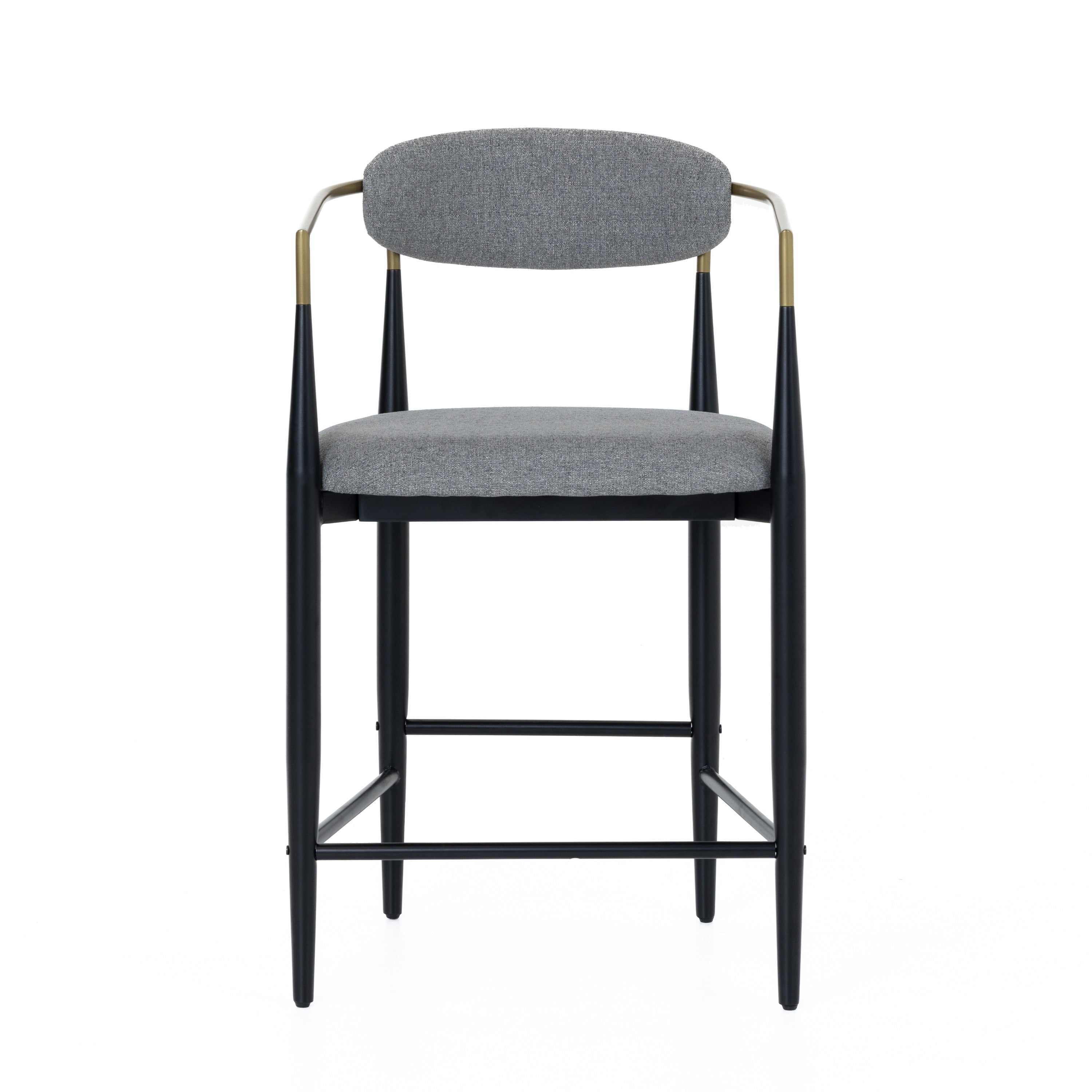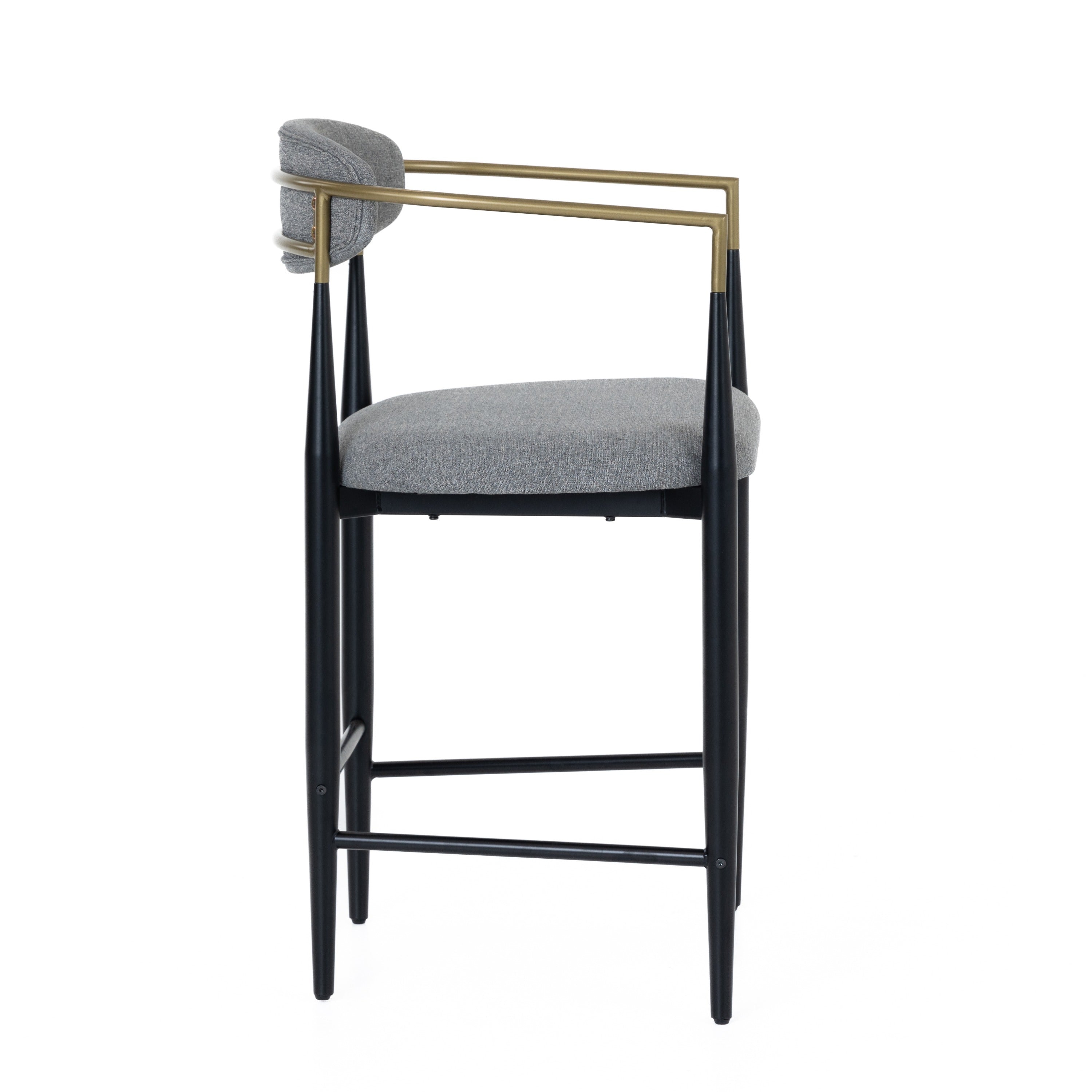 The Modrest Buchtel Mid-Century Modern Counter Chair is a striking blend of elegance and contemporary design. Upholstered in medium grey fabric, its rounded backrest and plush seat offer comfort and style. The chair features sleek black legs, elegantly tapered for a sophisticated look, while the gold armrests add a luxurious touch. Perfect for adding a chic accent to any bar or kitchen space, this chair effortlessly combines form and function, making it a standout choice for modern interiors.
