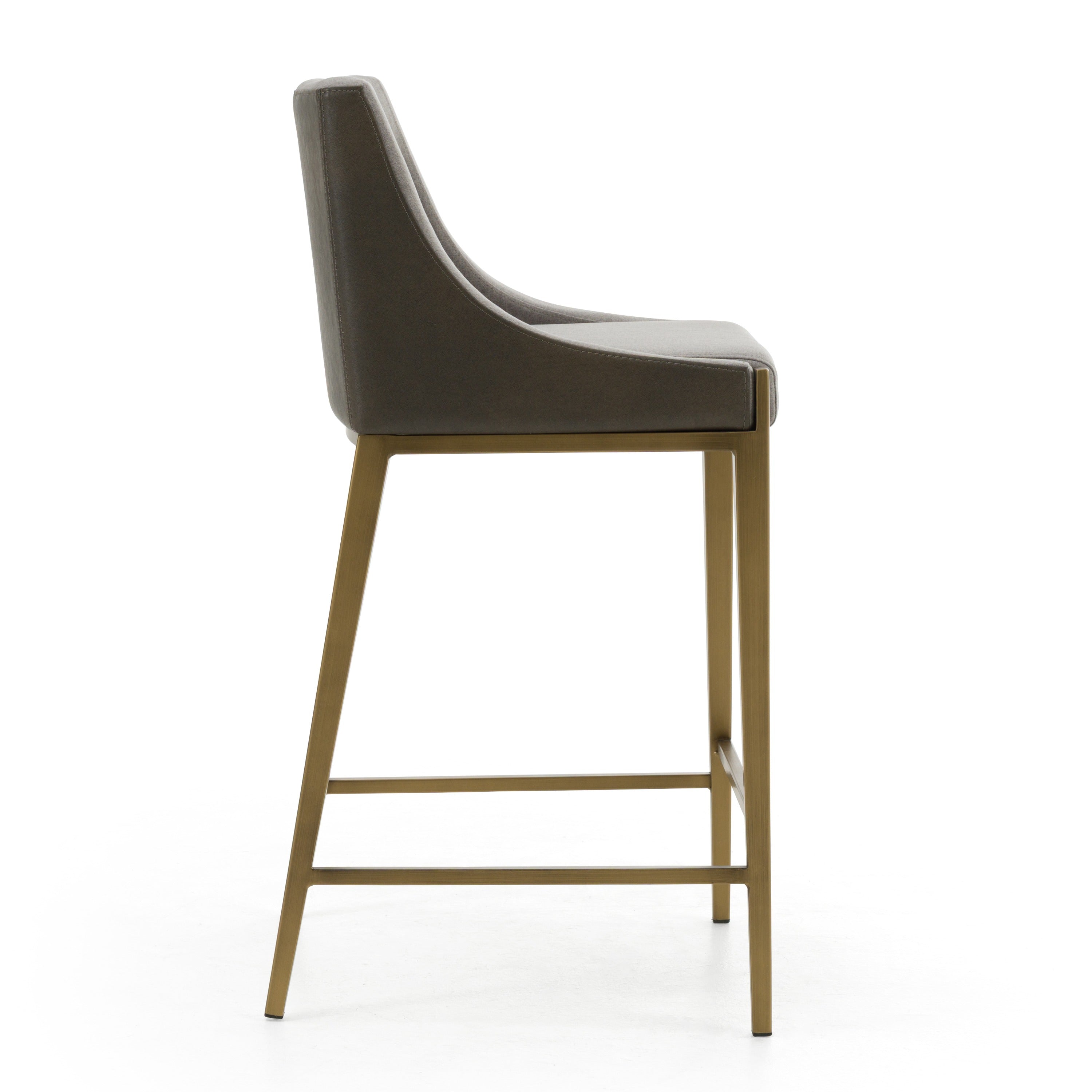 Solidly built and comfortable Contemporary Fairview Counter Stool is made from Antique Brass finished stainless steel and soft Grey Fabric.