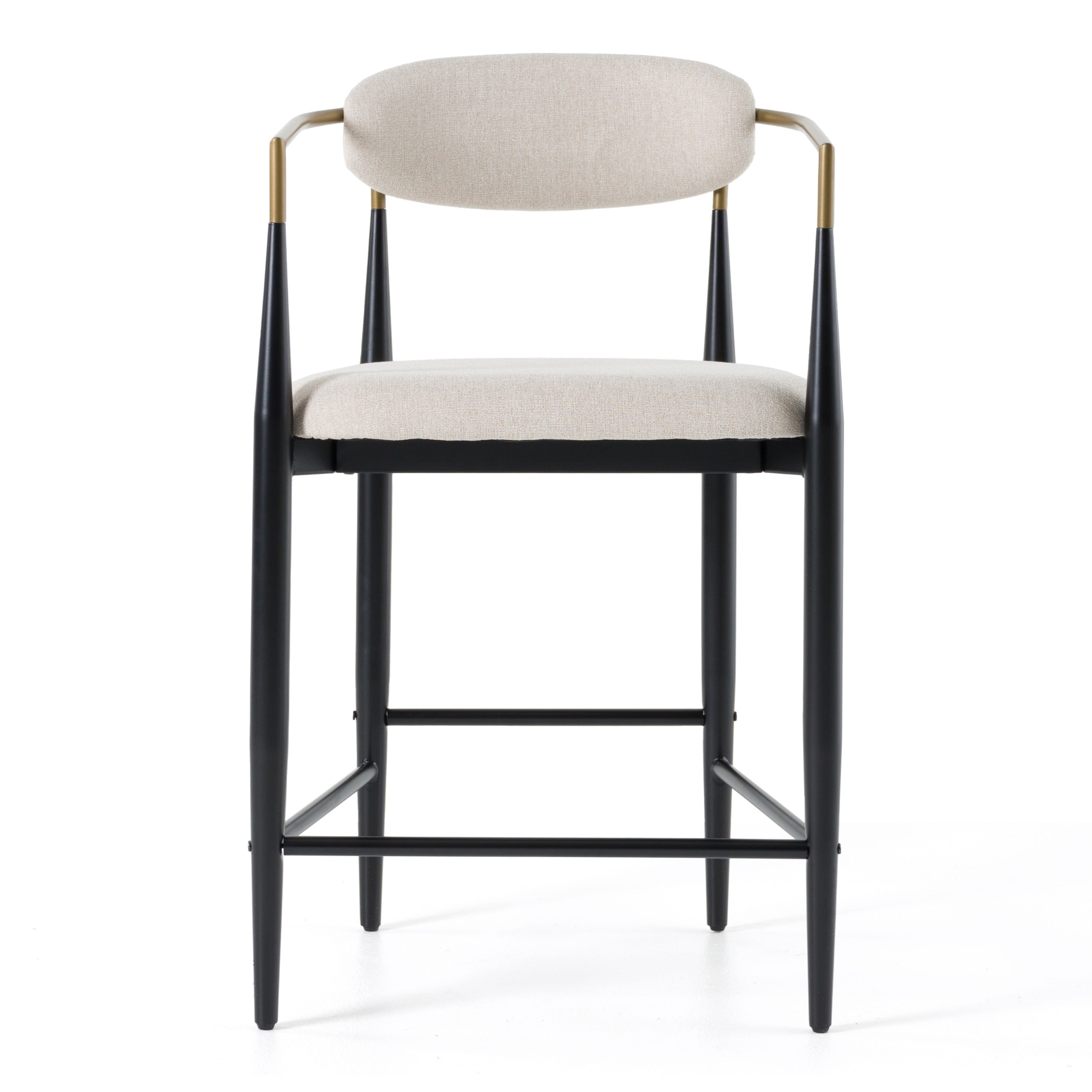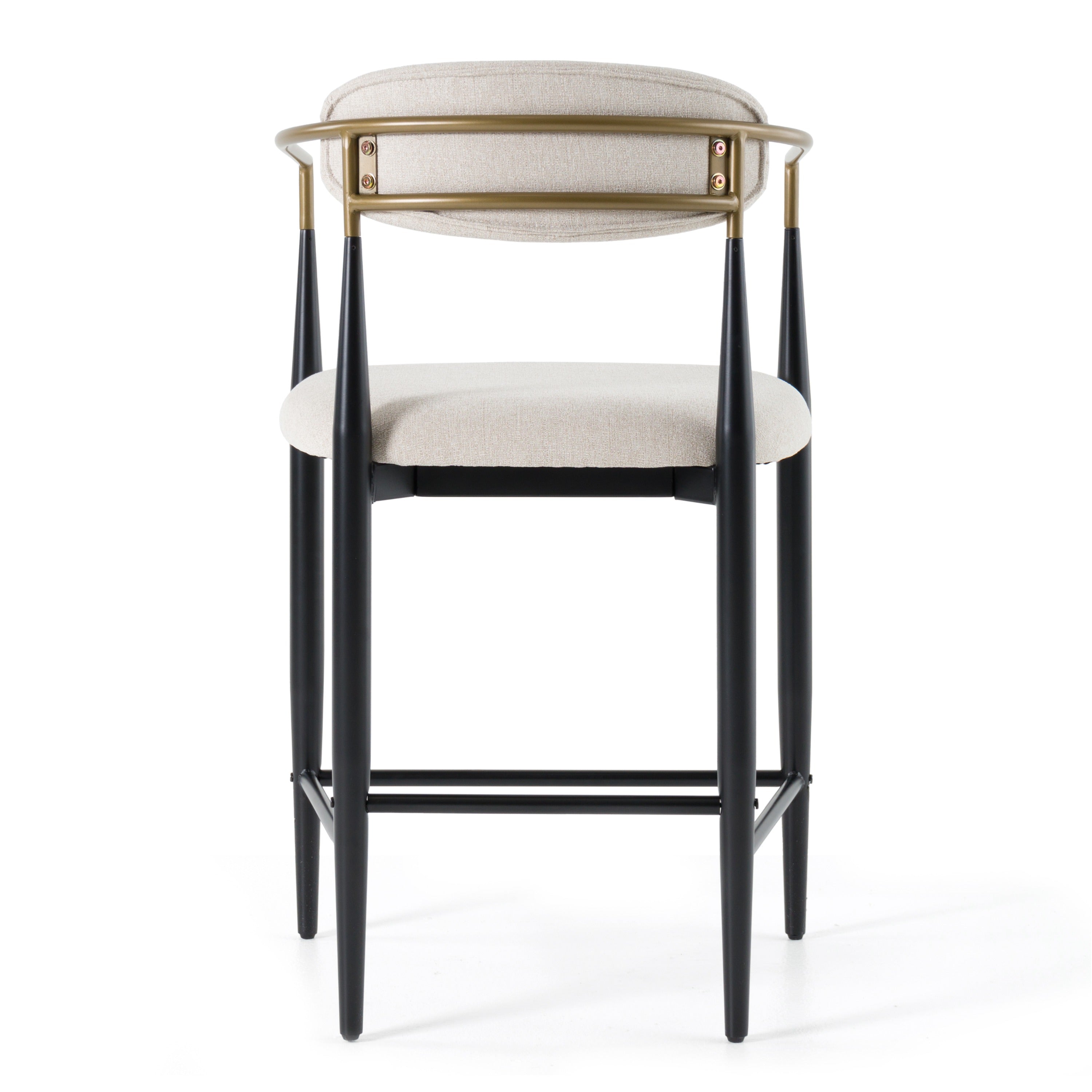 The Modern Buchtel Counter Chair combine excellent quality materials and superb design that makes it a stunner in your dining room. The light grey fabric upholstery back & seat cushion and black & gold metal arms and legs bring style and elegance to a dining experience. The Buchtel also comes in a dining height chair.