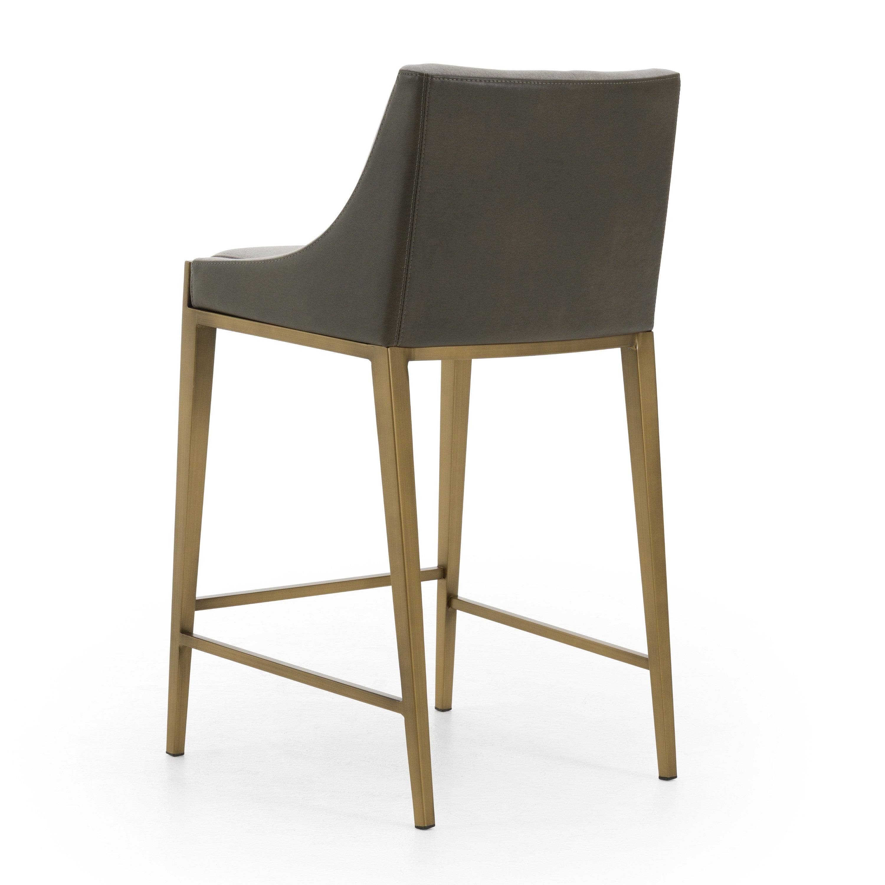 Solidly built and comfortable Contemporary Fairview Counter Stool is made from Antique Brass finished stainless steel and soft Grey Fabric.