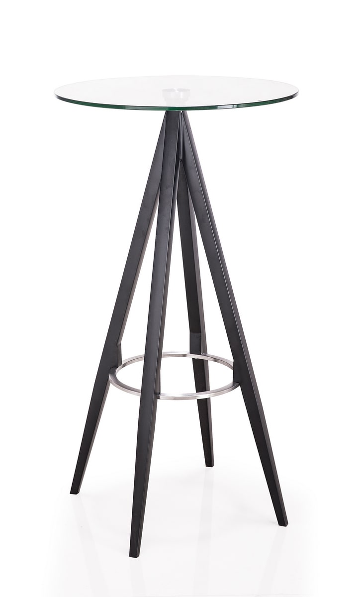 The Dallas bar table features a 10mm thick clear round tempered glass top, over a black powder coated metal, 4-pronged base, with a circular brushed stainless steel footrest. The simple style allows versatility, meaning this bar table can blend in with many different decorating styles, and the material neutrality allows for different color scheme inclusions.