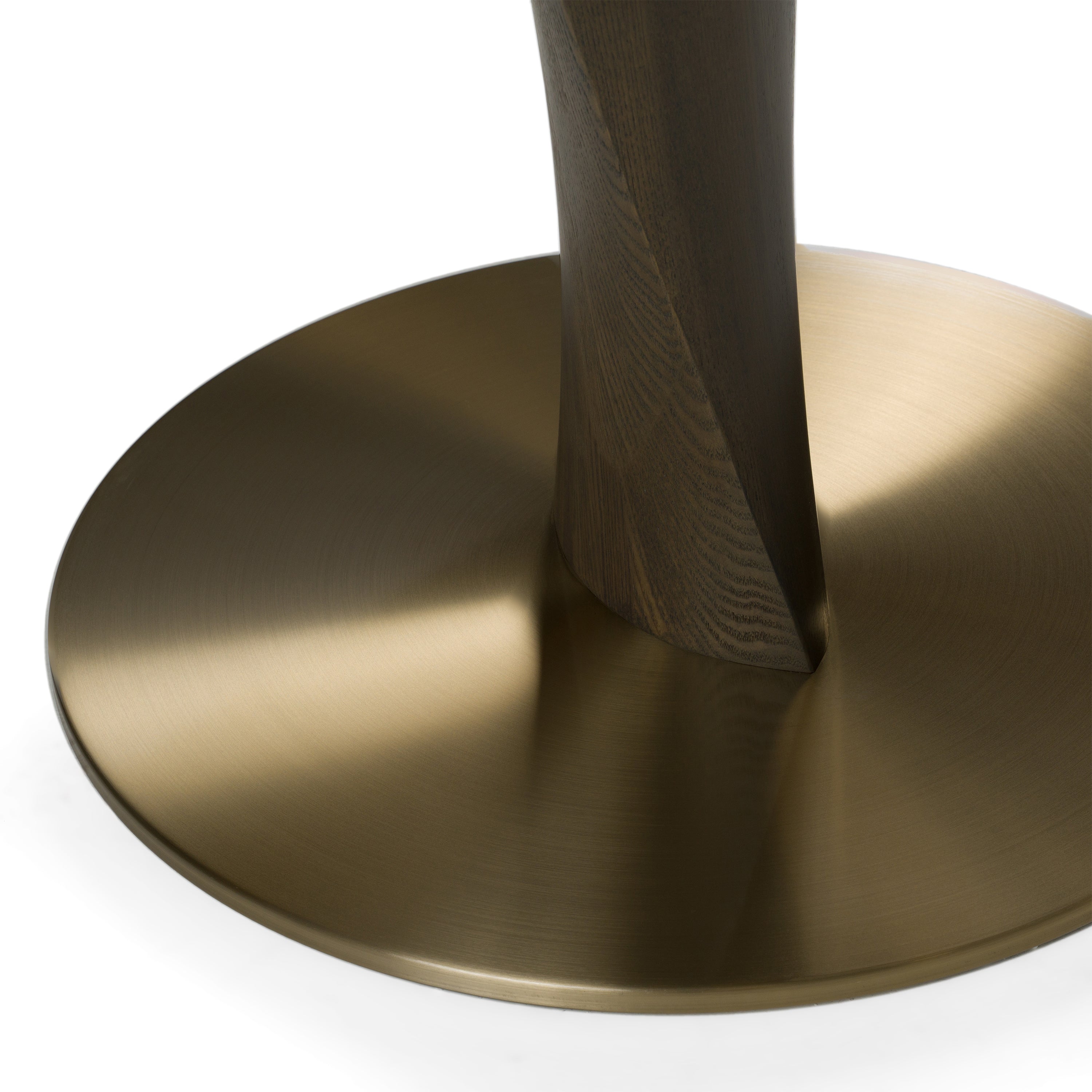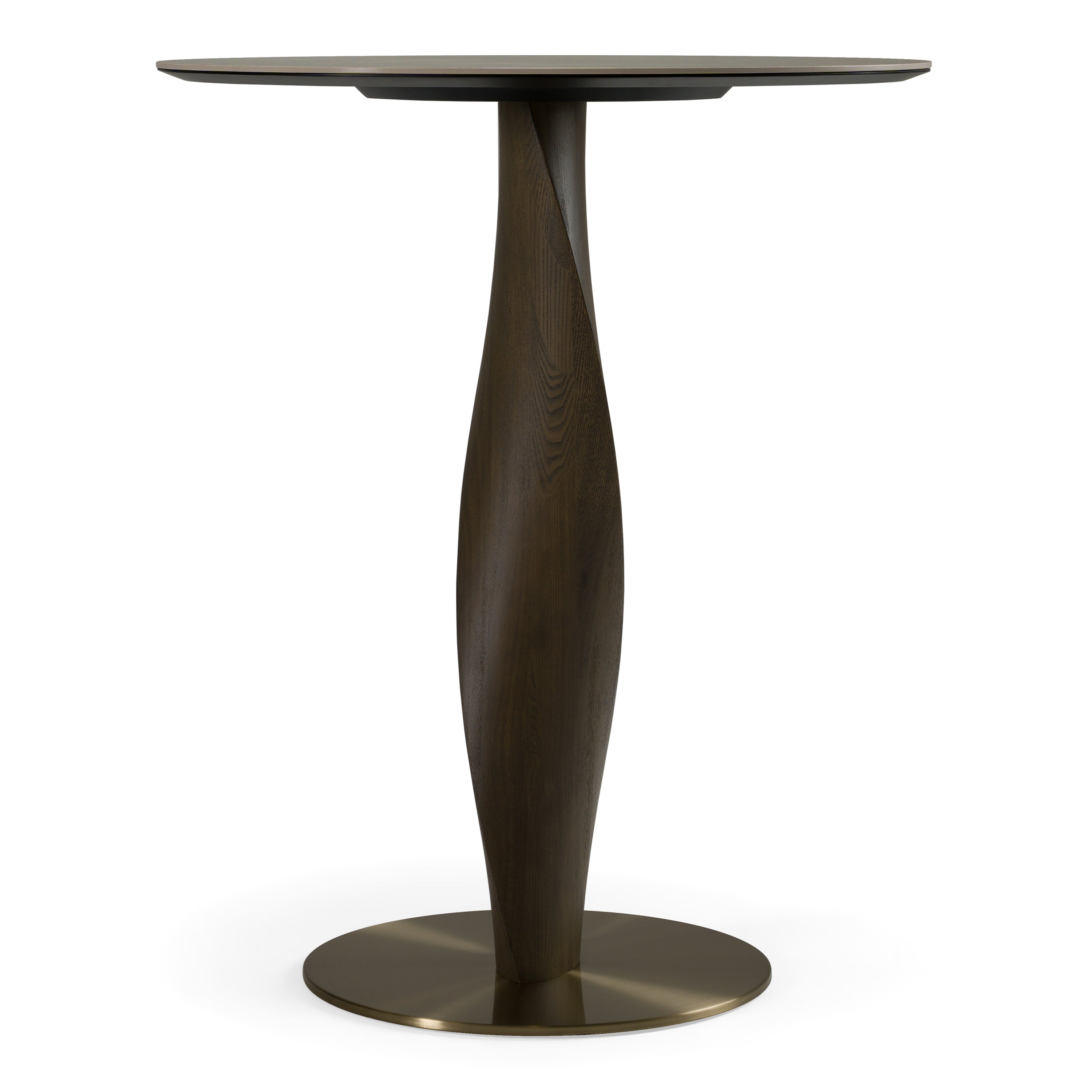 The Modrest Calvary Bar Table embodies a stunning mid-century modern design with its sleek, round ceramic top featuring a captivating grey ash marbled finish. The gracefully twisted wood base adds an artistic flair, seamlessly transitioning from the circular surface to the polished brass foot, enhancing its contemporary elegance. Its unique silhouette and refined materials create a focal point that elevates the ambiance of any interior.