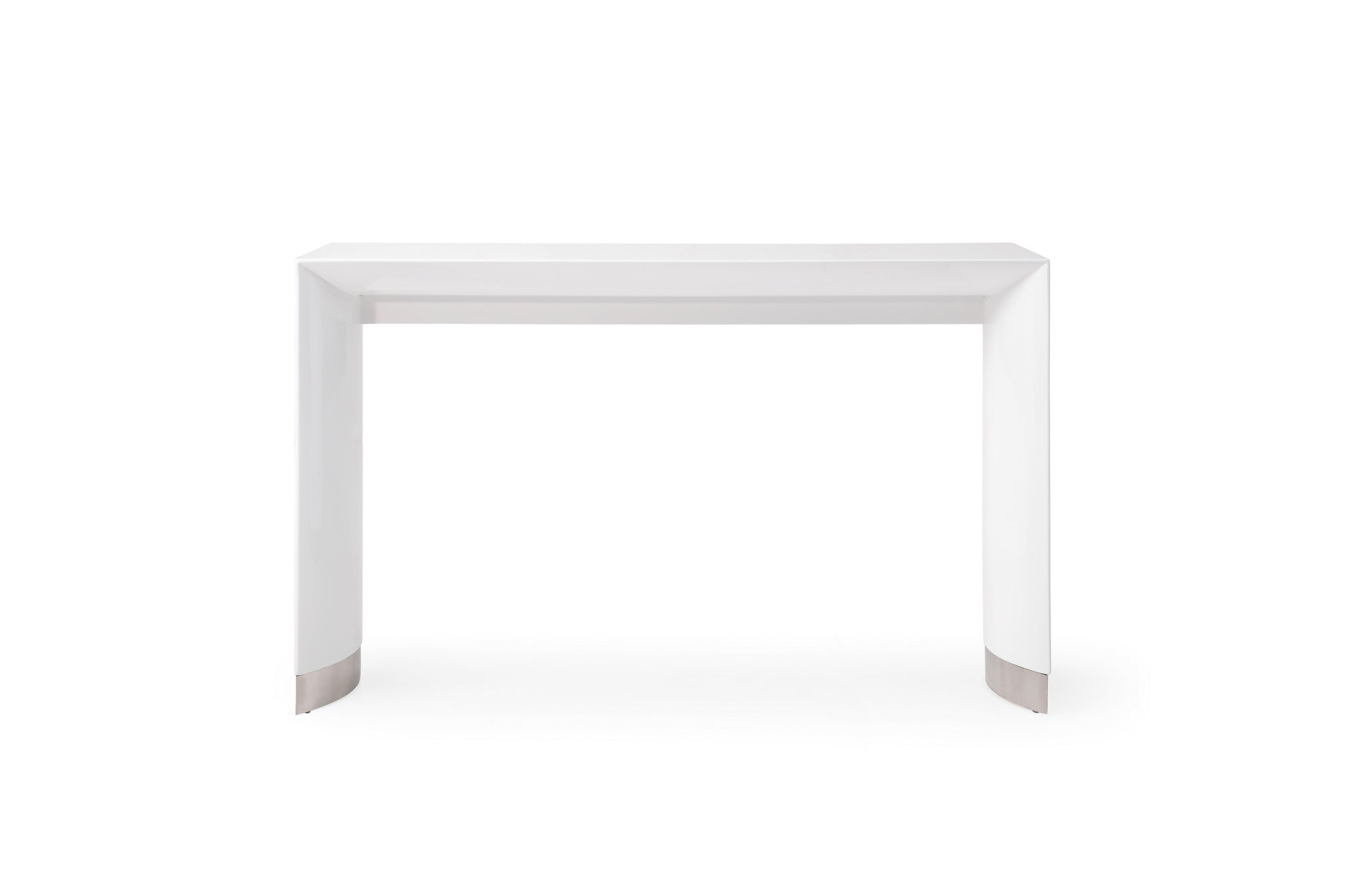 The Corbett is an ultra modern bar table that will fit perfectly in spall spaces. The 57 inch table is almost 18 inches deep, leaving enough space for four while taking up a small anmount of floor soace. The white laquer finish with match with almost anything while the curvalinear legs create depth and texture .