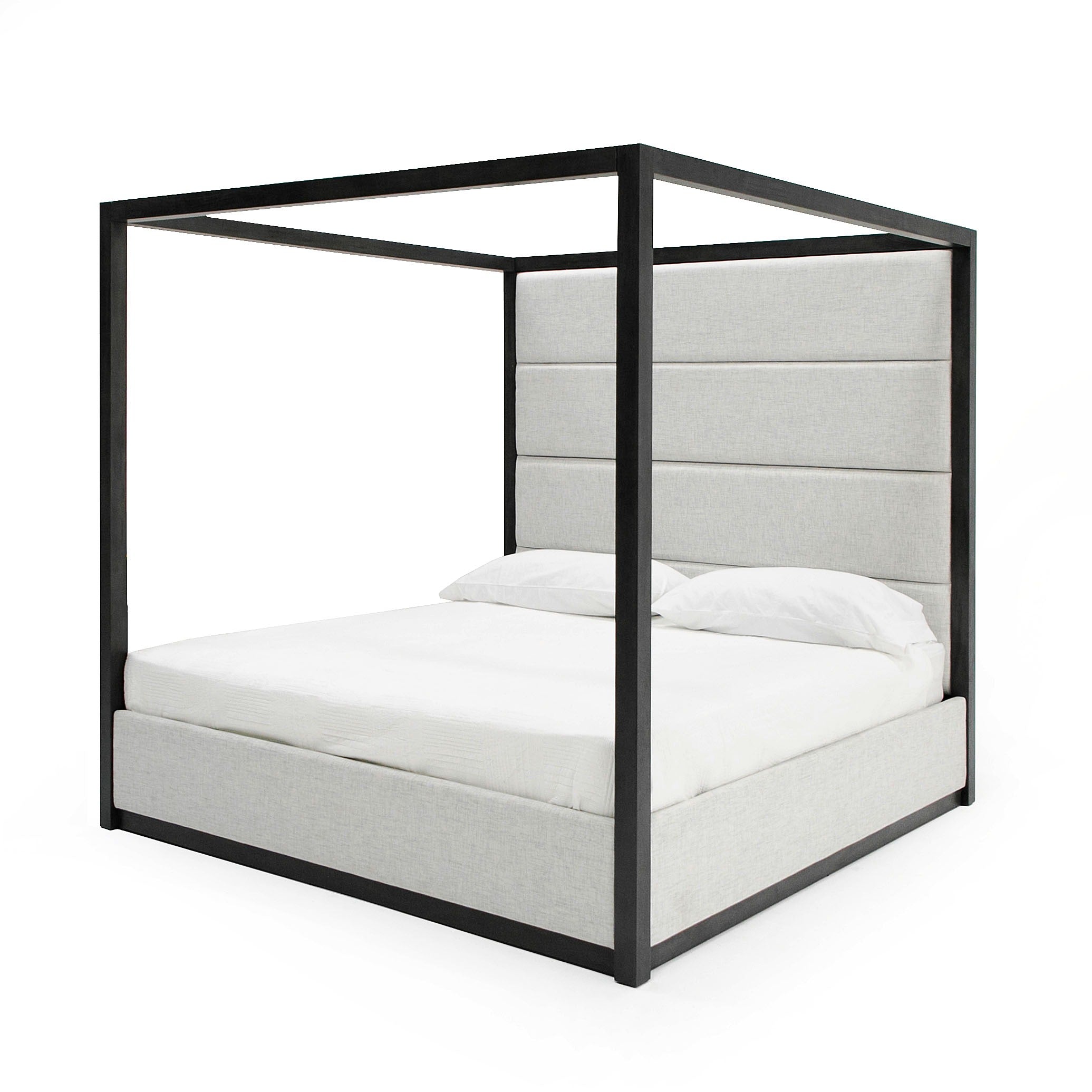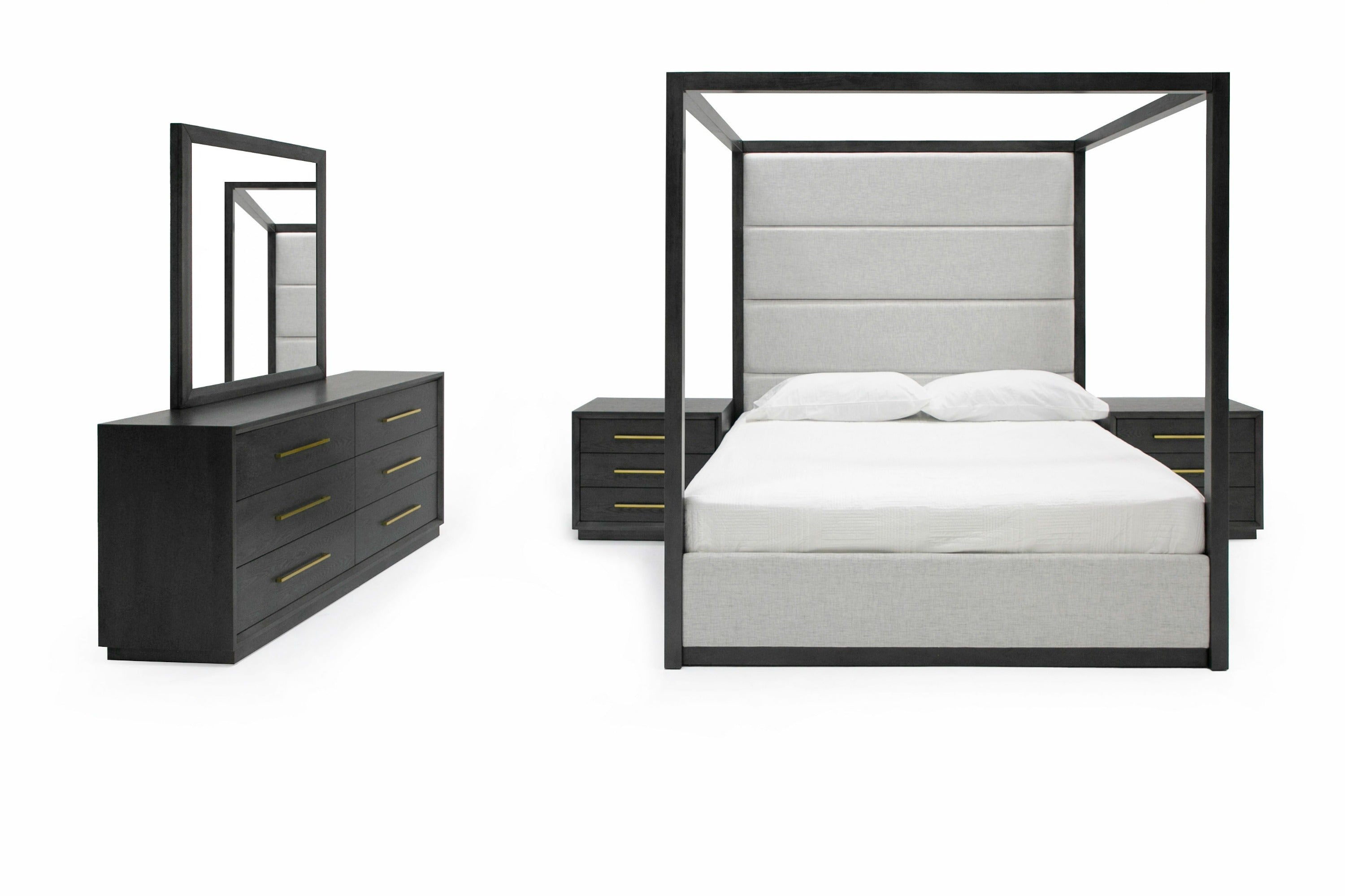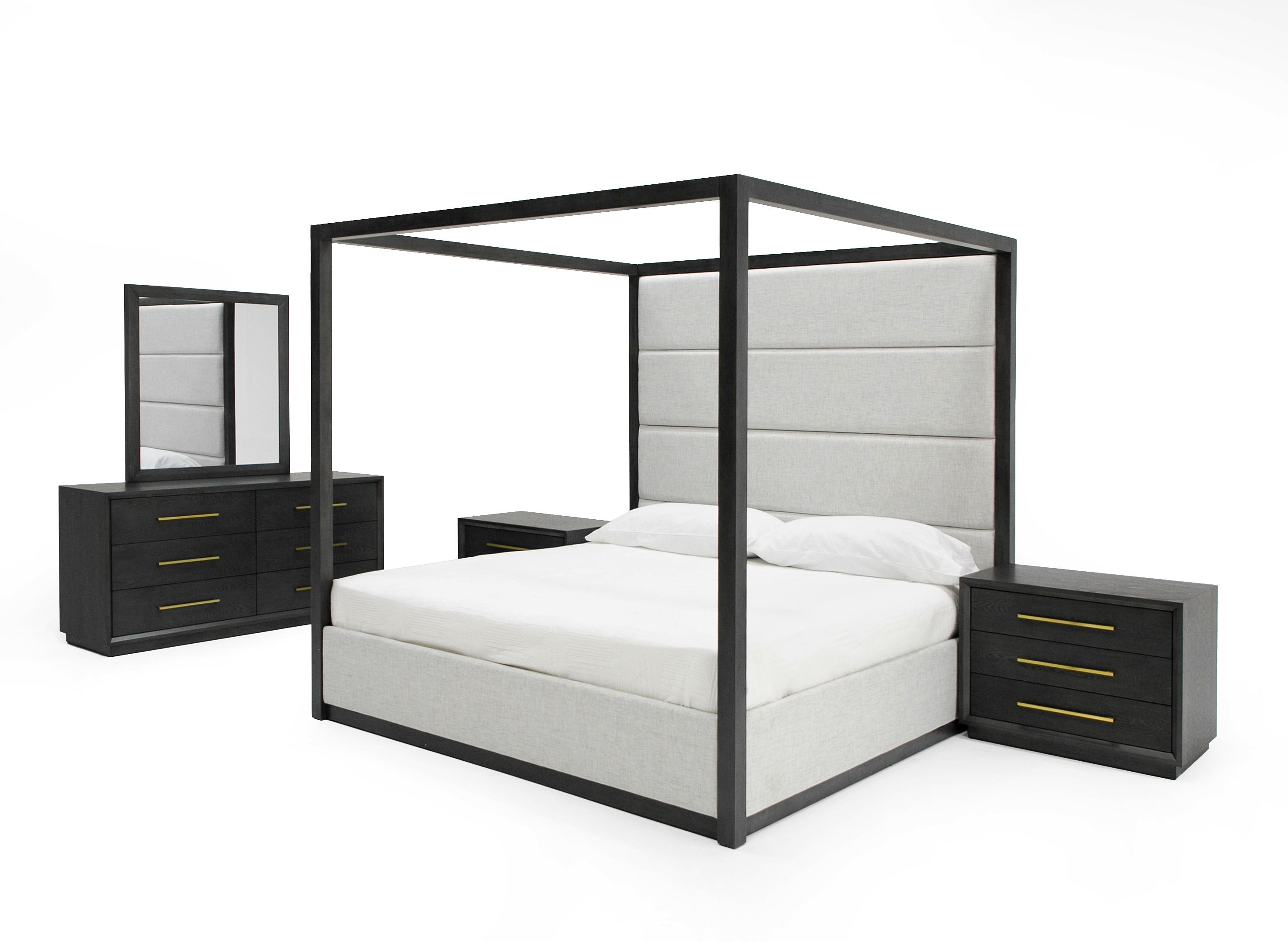 Our Manhattan Canopy Bed set is the ultimate in comfort and luxury. It's plush headboard paired with your soft inviting mattress make it the perfect place to unwind and relax. From the elegant upholstered platform in ivory fabric that cushions you, to the gray wood canopy that encompasses you. Rest assured that you'll enjoy a restful night's sleep for years to come. This set provides for a bed, two nighstands, dresser and mirror in matching gray wood finish. Availiable in both Eastern King and Queen with slats provided. No box spring required.