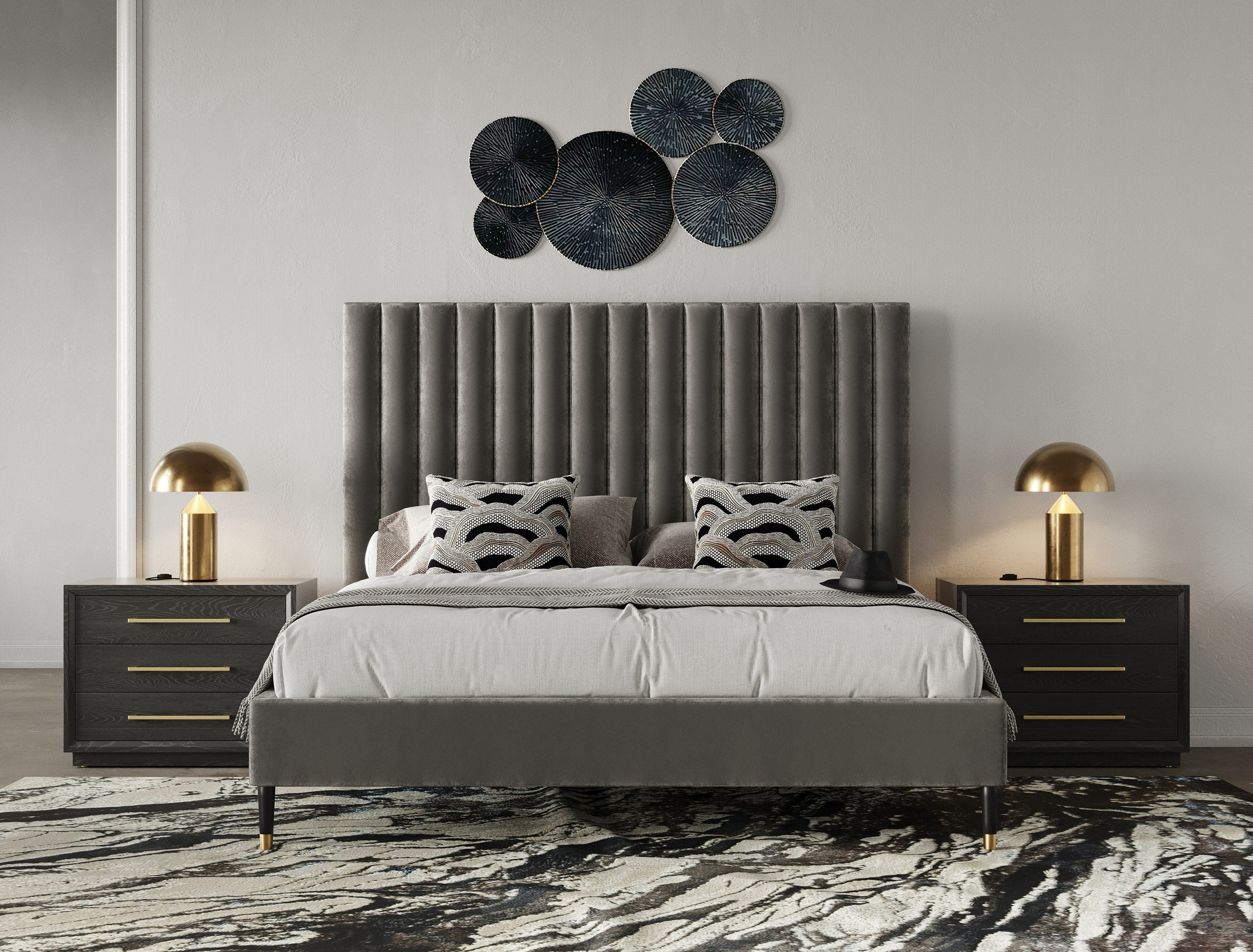 The Hemlock Bed is the perfect grand bed for your glam home. The channel tufting is complimented by the soft velvet upholstery. Adorned with tapered legs that add a touch of mid-century style, this piece is truly versatile.