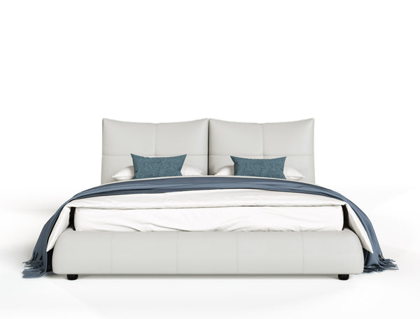 The Modrest Patrick modern bed exudes contemporary elegance with its light grey leather upholstery and sleek, minimalist design. The standout feature is the distinctive double headboard, which adds a sophisticated touch while providing comfort. Its smooth lines and refined aesthetic make it a perfect centerpiece for any modern bedroom, blending functionality with luxury seamlessly.
