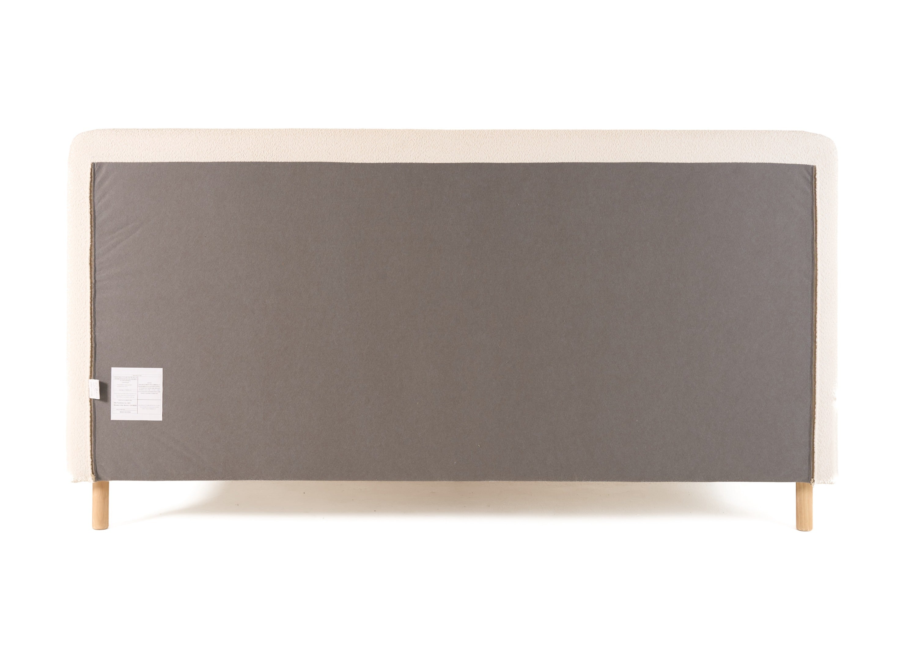The Modrest Electra bed showcases a sleek, modern design with an inviting ivory fabric upholstery that exudes calm and sophistication. The headboard features a rectangular with rounded corners, plush back with elegant rubberwood accents that add warmth and contrast. Its minimalist profile, complemented by simple cylindrical legs, creates a contemporary feel perfect for any bedroom oasis. The overall aesthetic blends comfort with style, making it a striking centerpiece for relaxation and tranquility.