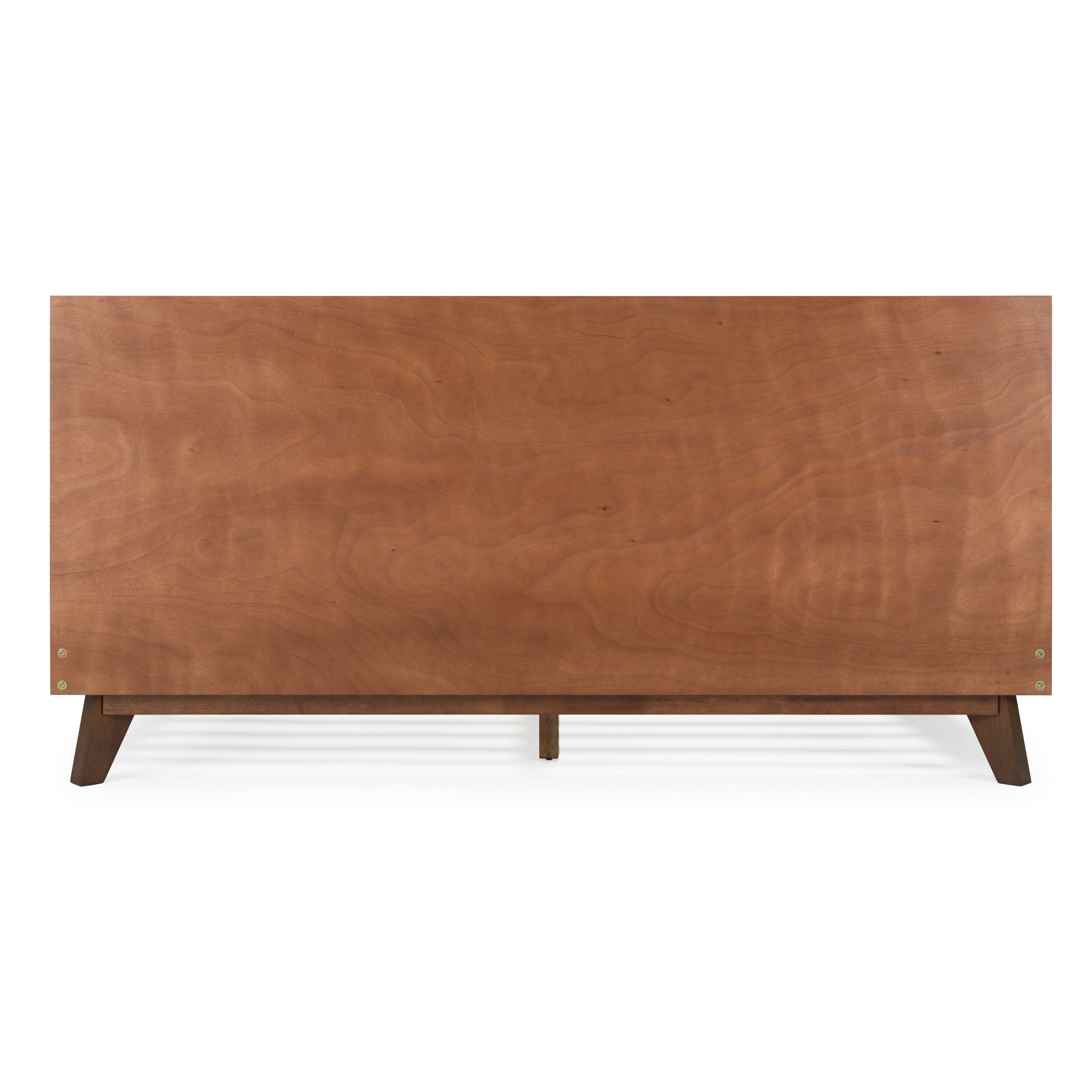 The Soren Bed is a mid-century, farmhouse style bed. It is finished in a walnut veneer on the headboard and the legs are solid walnut. The oversized, chevron-patterned headboard makes a statement in any bedroom. The low platform style is expertly supported and it requires no box spring for a low profile and finished look.