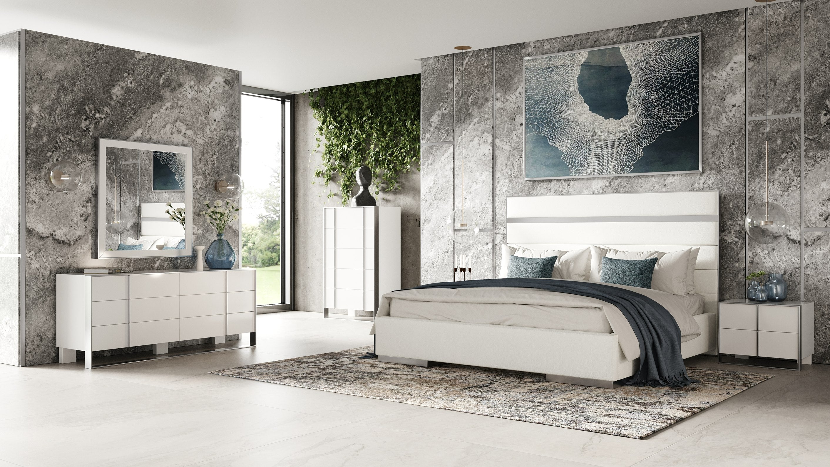 The Modrest Cartier - Modern White Vegan Leather & Stainless Steel Bedroom Set exemplifies a smart stylish design featuring a white upholstered headboard with Polished Stainless Steel Accents. Framed in white vegan leather, this modern bed is available in Queen and Eastern King sizes and stands on silver feet. Some assembly is required.
