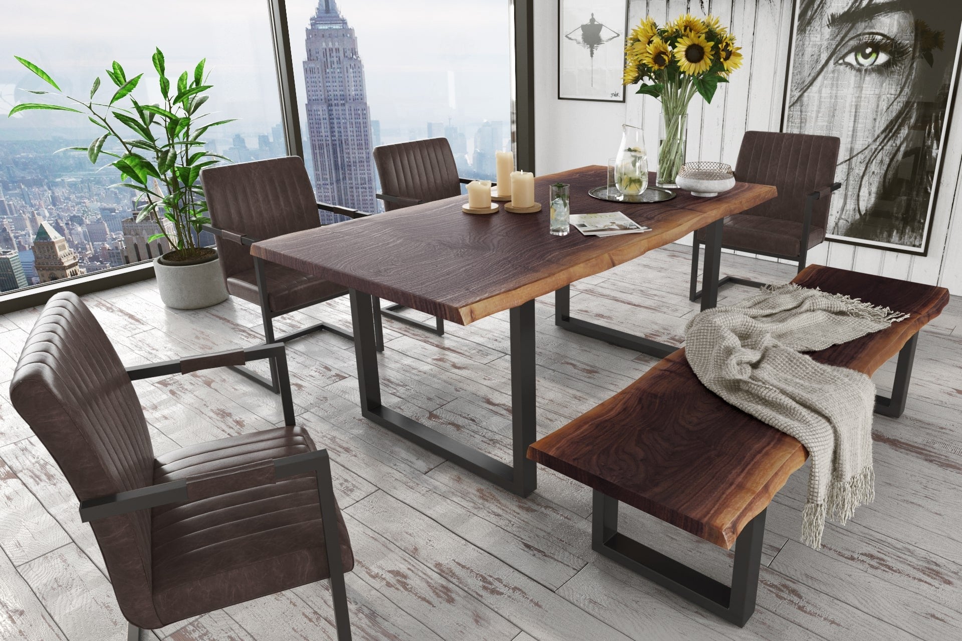 Give your dining room a modern rustic air with the Modrest Taylor Modern Live Edge Wood Dining Bench. Featuring a solid 1 ½" thick Acacia wood bench top, the clean finish and live edges manifest the character and hue of the wood grains. Attached on sturdy black metal U-shaped legs, this modern bench can match any contemporary designed dining room.