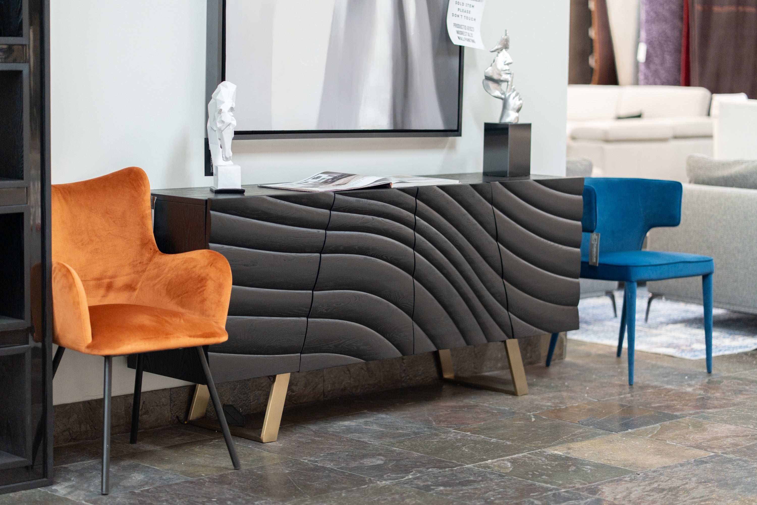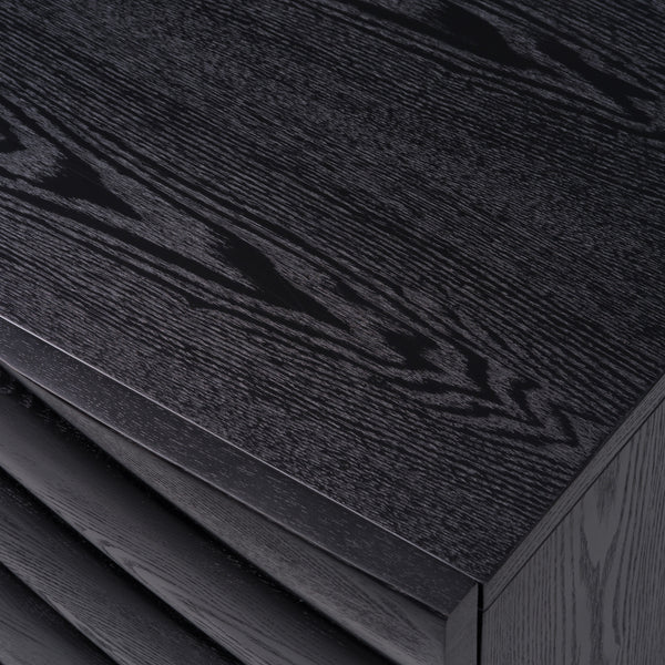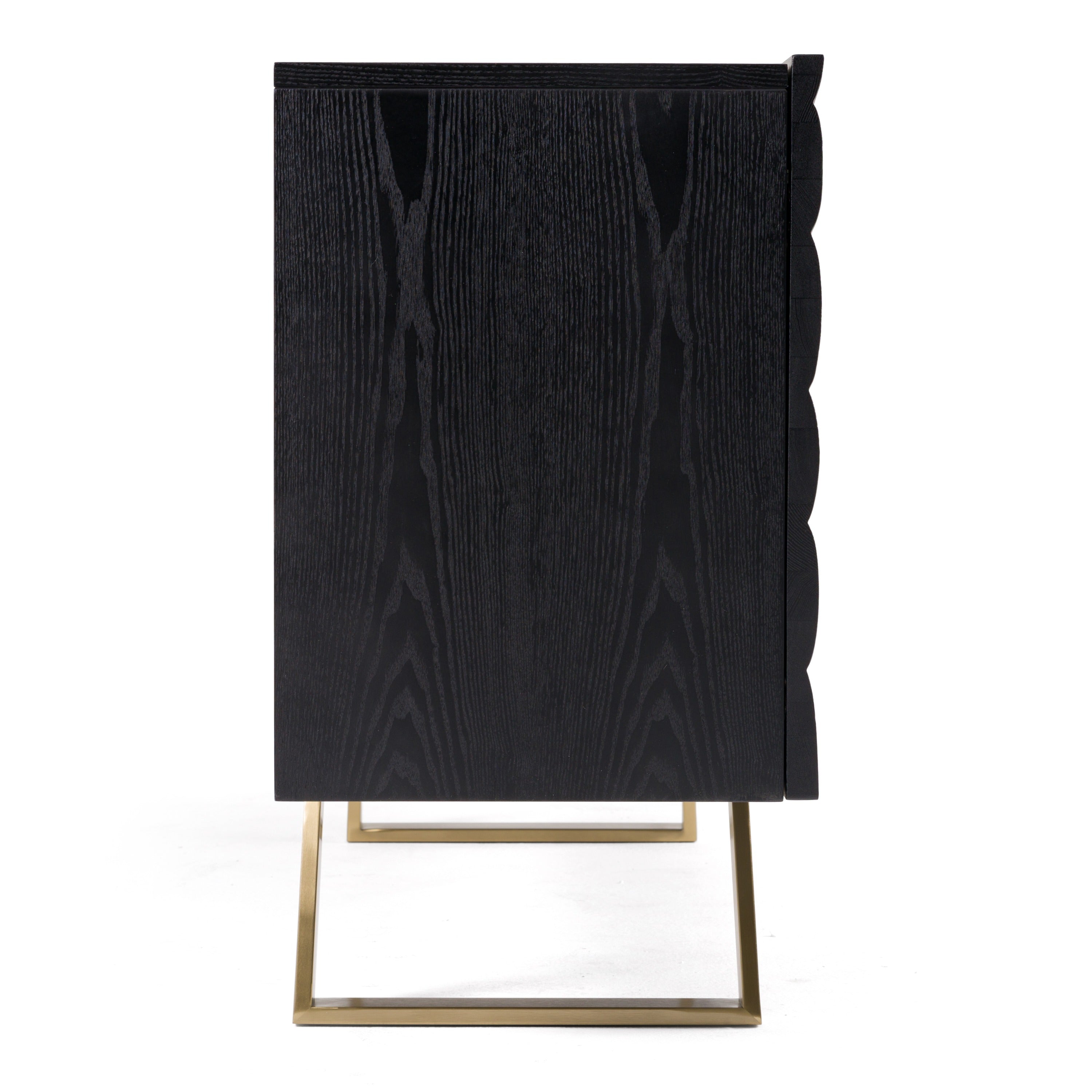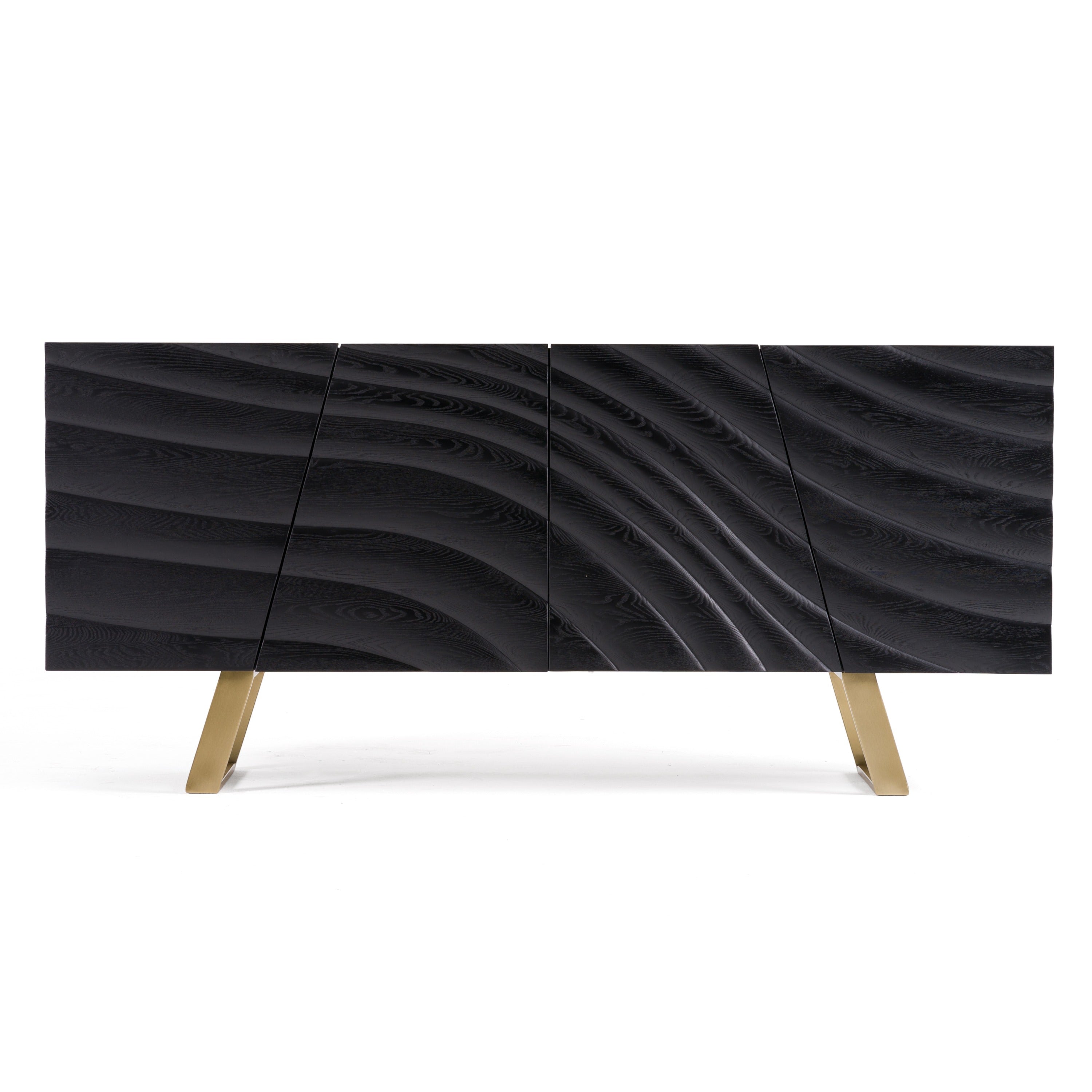 The Modrest Finley Mid-Century Black & Gold Buffet exudes a sophisticated elegance with its striking black finish and distinctive wave-patterned doors. The sleek design is complemented by gold legs, adding a touch of luxury to its mid-century modern aesthetic. This buffet combines functionality and style, making it an ideal statement piece for any dining or living space, perfect for displaying decor or storing essentials. Its unique texture and refined silhouette create an eye-catching focal point in contemporary interiors.
