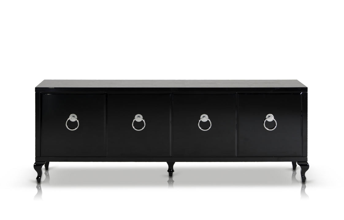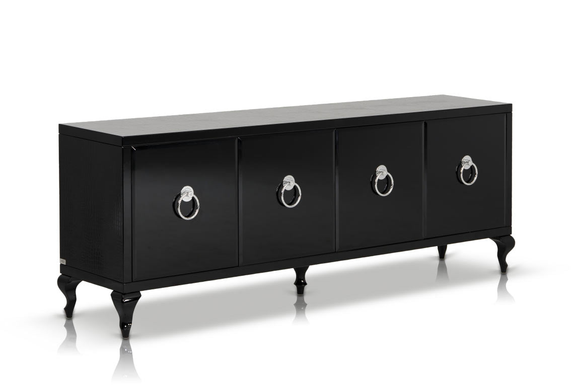 Four chrome rings act as handles for each of the four doors included in the buffet. Inner shelving lined with orange crocodile textured leatherette provides abundant storage space for your tableware. Featuring the A&X Collections signature laser-cut crocodile textured pattern, the Bellagio buffet will bring sophistication to any living space. Coated with a deep black lacquer, the buffet will match the rest of the Bellagio line from the exclusive A&X Collection.