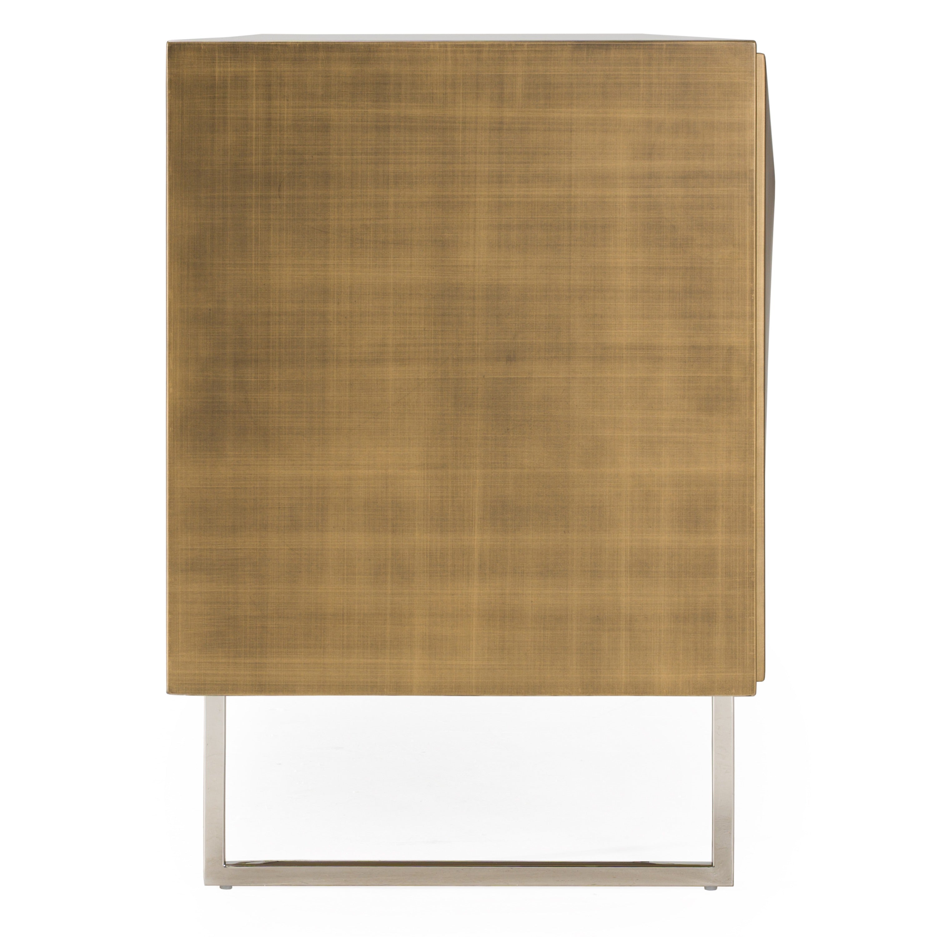 The Modrest Vanguard Modern Antique Brass Buffet exudes a bold yet refined sophistication, making it a standout in any contemporary home. Its geometric front, crafted with an antique brass finish, brings a sculptural edge that merges modern artistry with timeless elegance. Supported by brushed brass stainless steel legs, this piece offers both functionality and aesthetic appeal. With its sleek lines and soft-close doors, this buffet enhances the ambiance of any dining or living space, offering luxurious storage that harmonizes effortlessly with the most discerning design sensibilities.